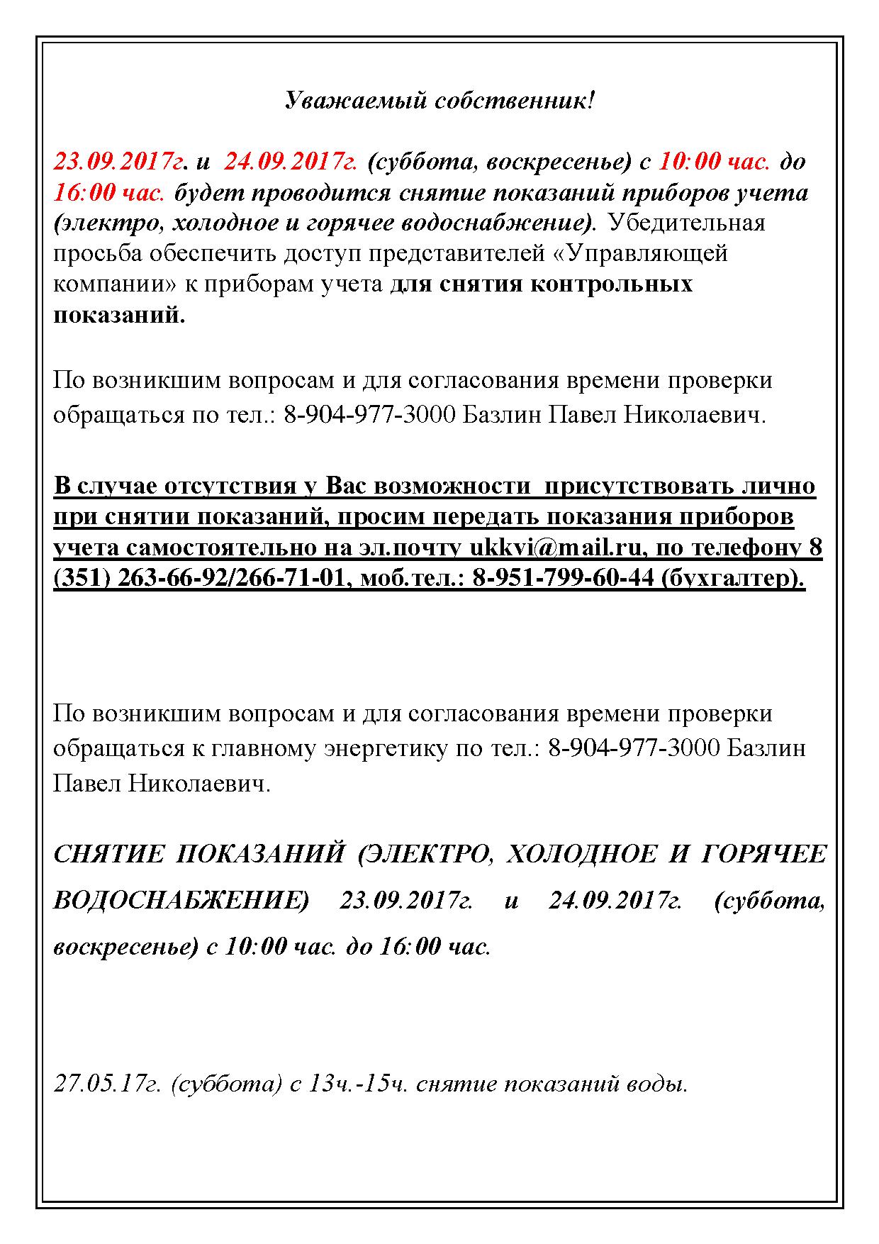 Собщение о проведении 23.09.2017г.-24.09.2017г. снятия показаний приборов учета