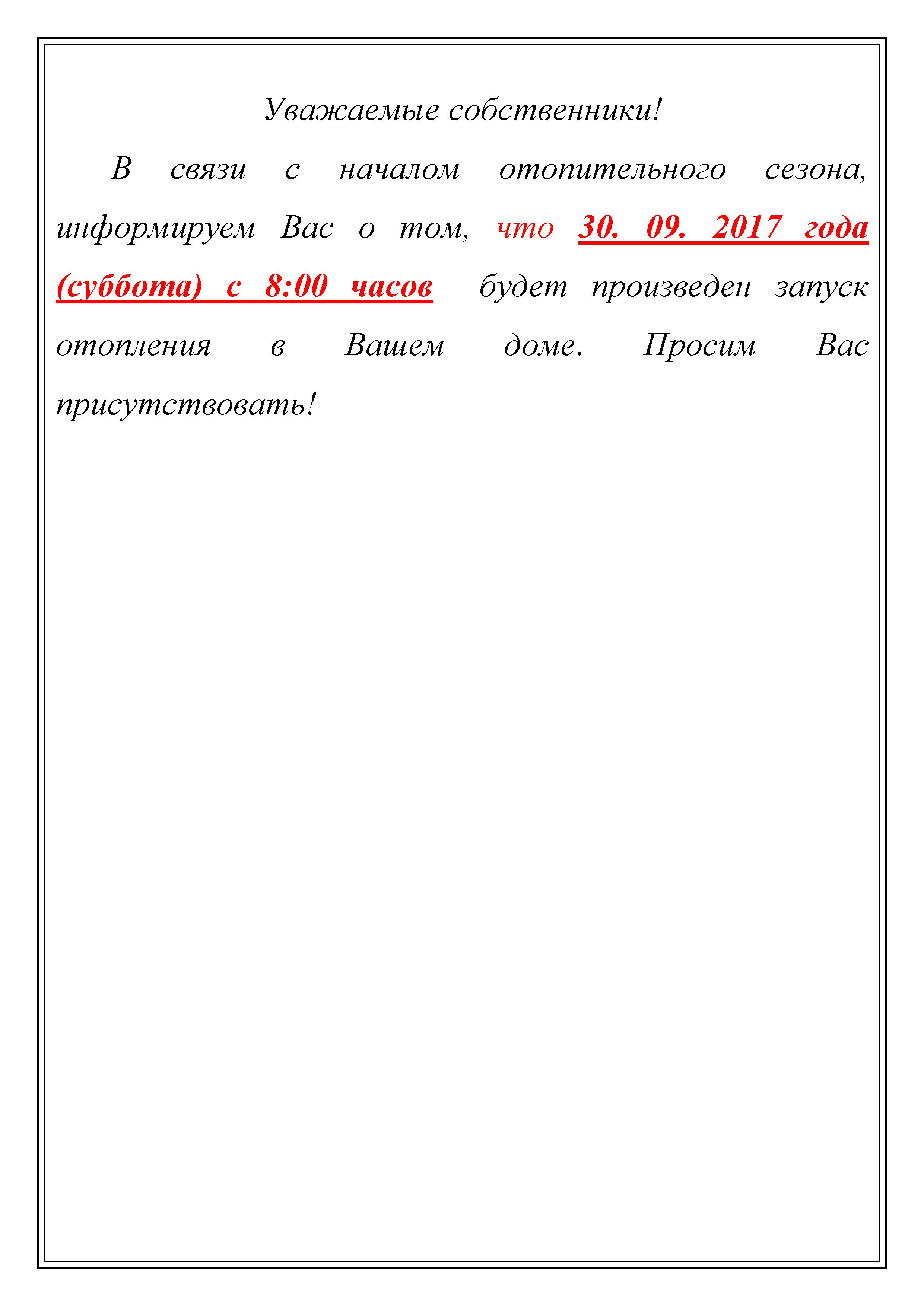 Сообщение о проверке отопительных систем 30.09.2017