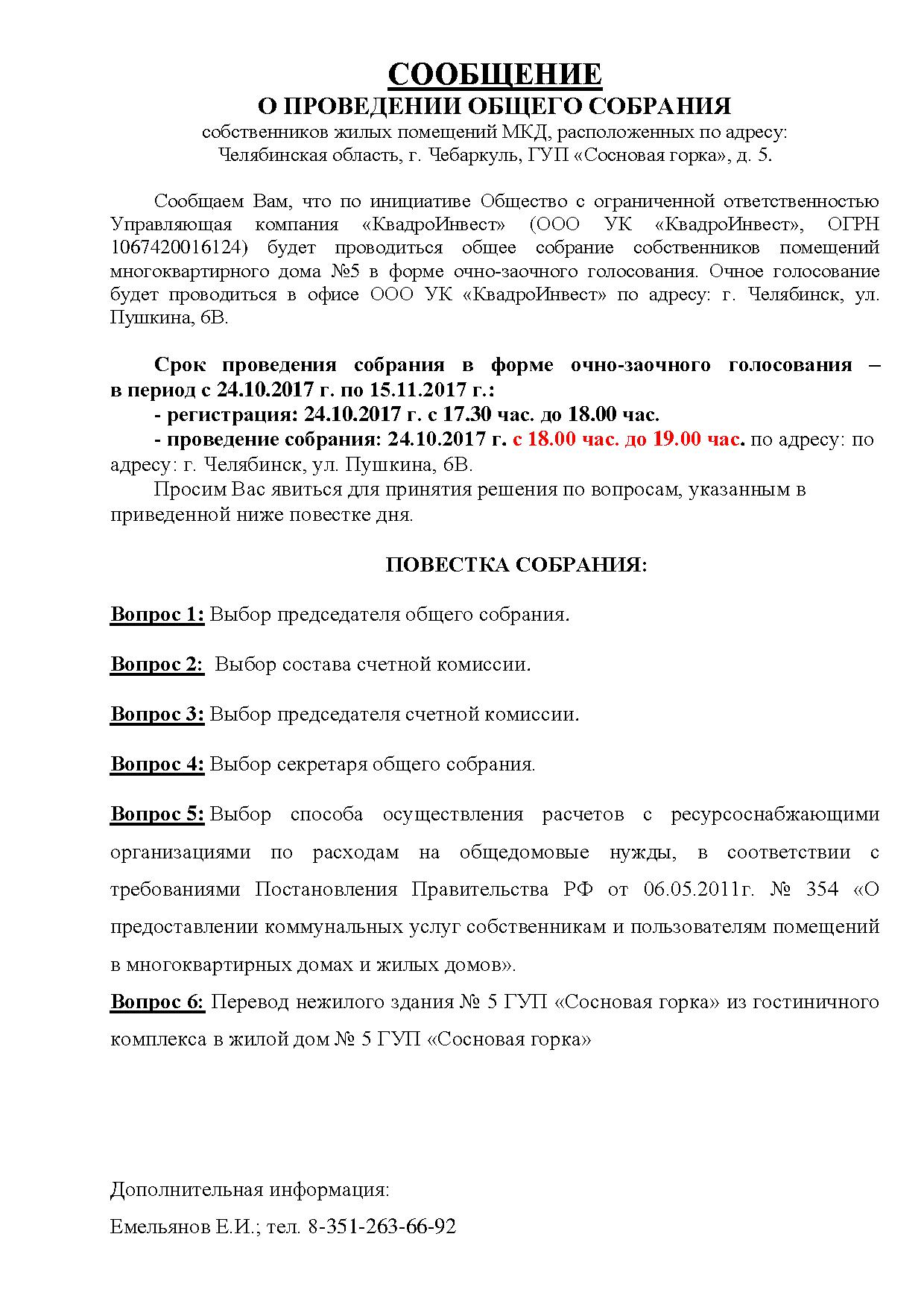 Сообщение о проведении общего собрания собственников д. 5, ГУП "Санаторий "Сосновая горка"