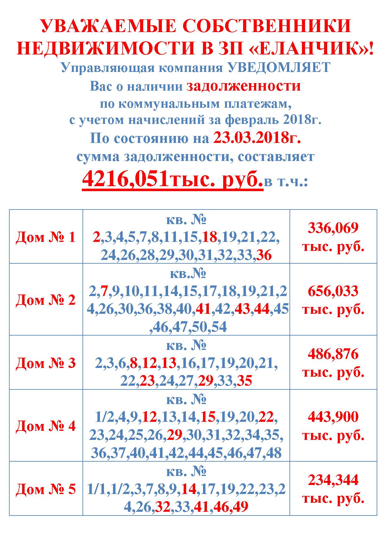 Задолженность по оплате жилищно-коммунальных услуг ЗП"Еланчик" по состоянию на 23.03.2018г.