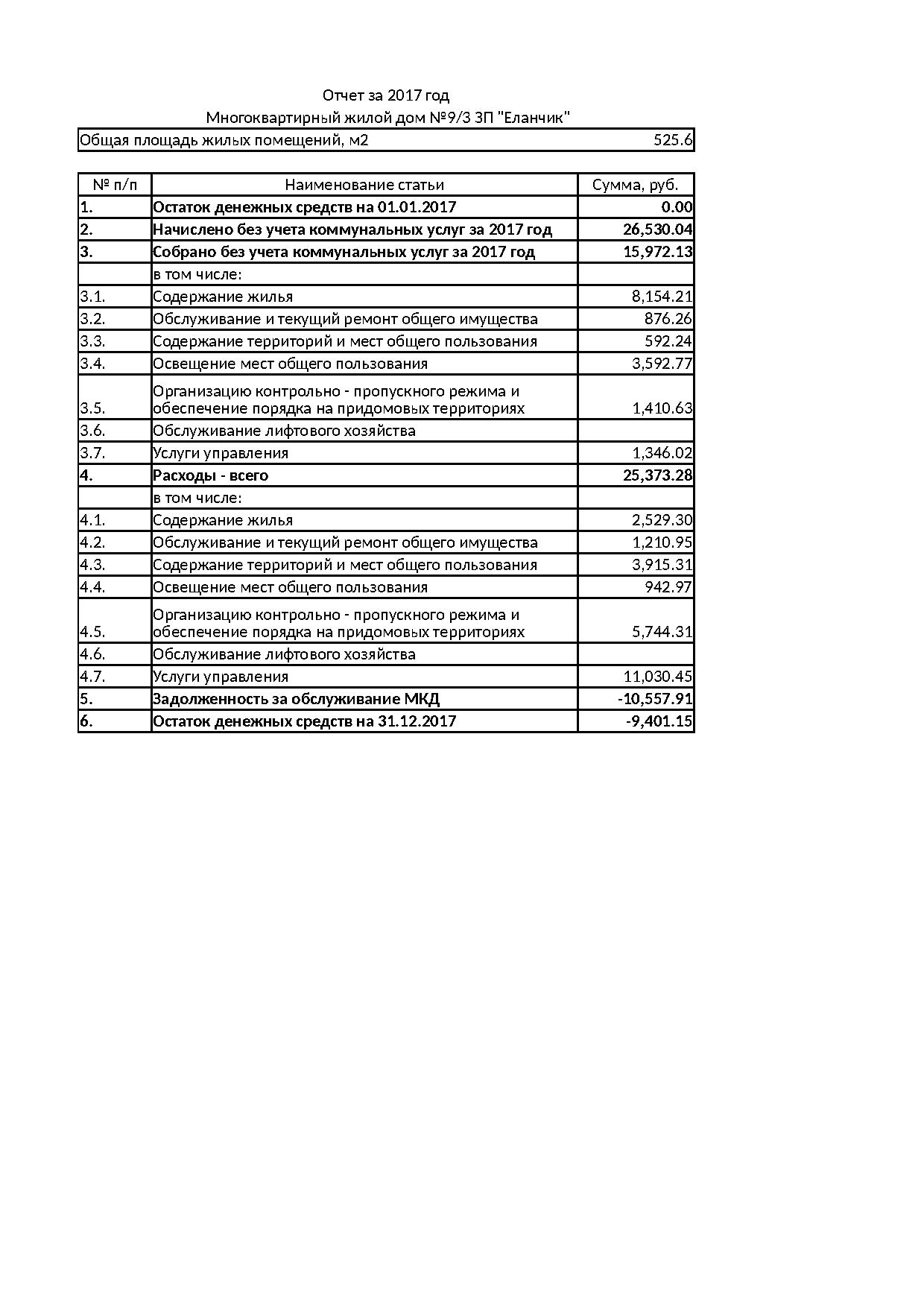 Отчет о выполнении договора управления МКД № 9/3 Закрытый поселок "Еланчик" за 2017 год