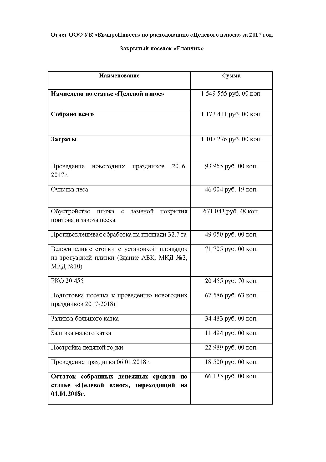 Отчет о расходовании начисленных и собранных денежных средств по статье "Целевой взнос" за 2017 год