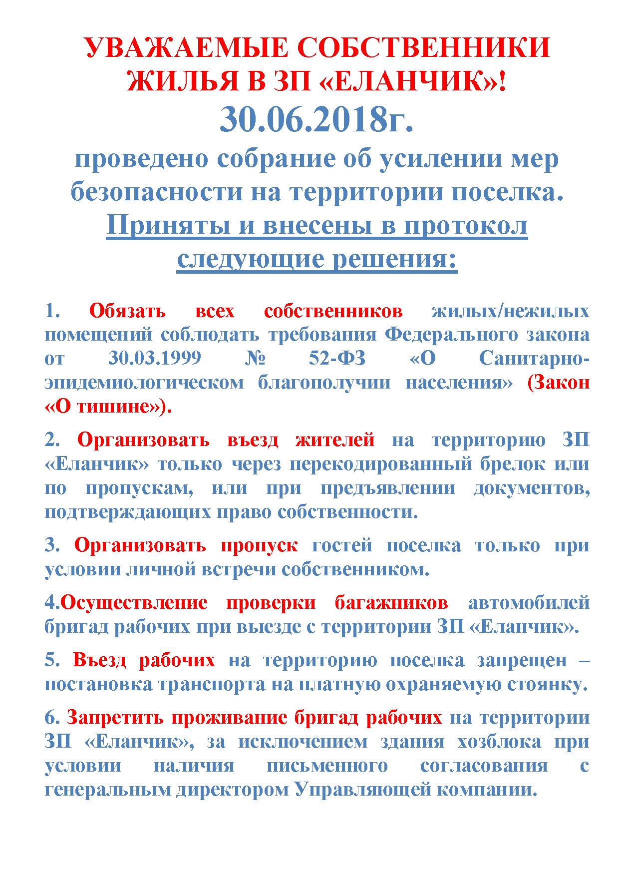Протокол № 1от «30» июня 2018 года общего собрания собственников жилых помещений Закрытого поселка «Еланчик»