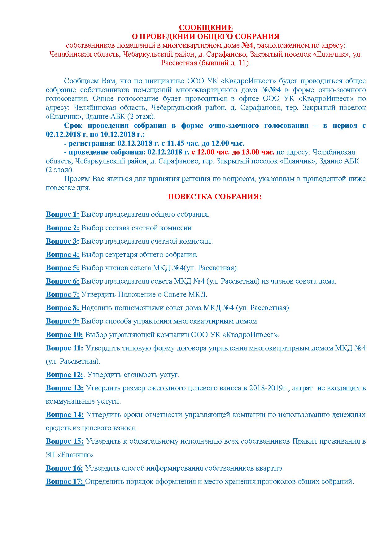 Сообщение о проведении собрания собственников МКД № 4 по ул. Рассветная (бывший д. 11) Закрытого поселка "Еланчик"