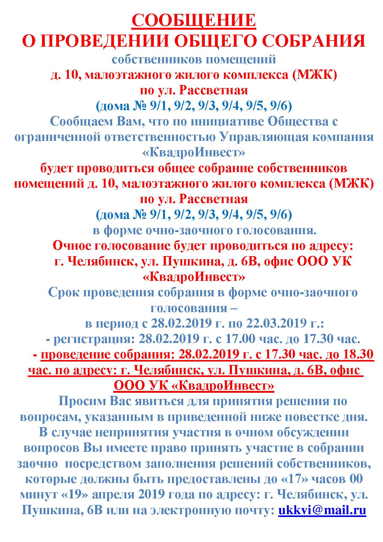 Сообщение о проведении общего собрания собственников малоэтажного жилого комплекса (МЖК) по ул. Рассветная Закрытого поселка "Еланчик" (д.№ 9/1, 9/2, 9/3, 9/4, 9/5, 9/6)