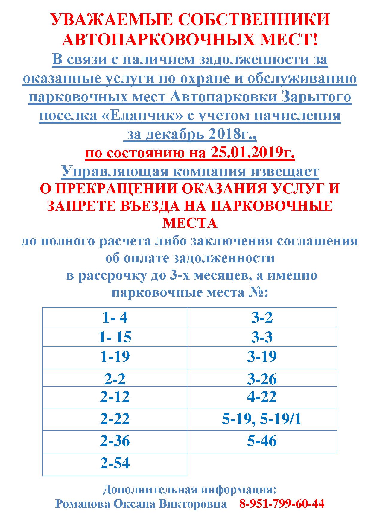Уведомление о прекращении оказания услуг по обслуживанию парковочных мест на Автопарковке Закрытого поселка "Еланчик" лицам, имеющим задолженность