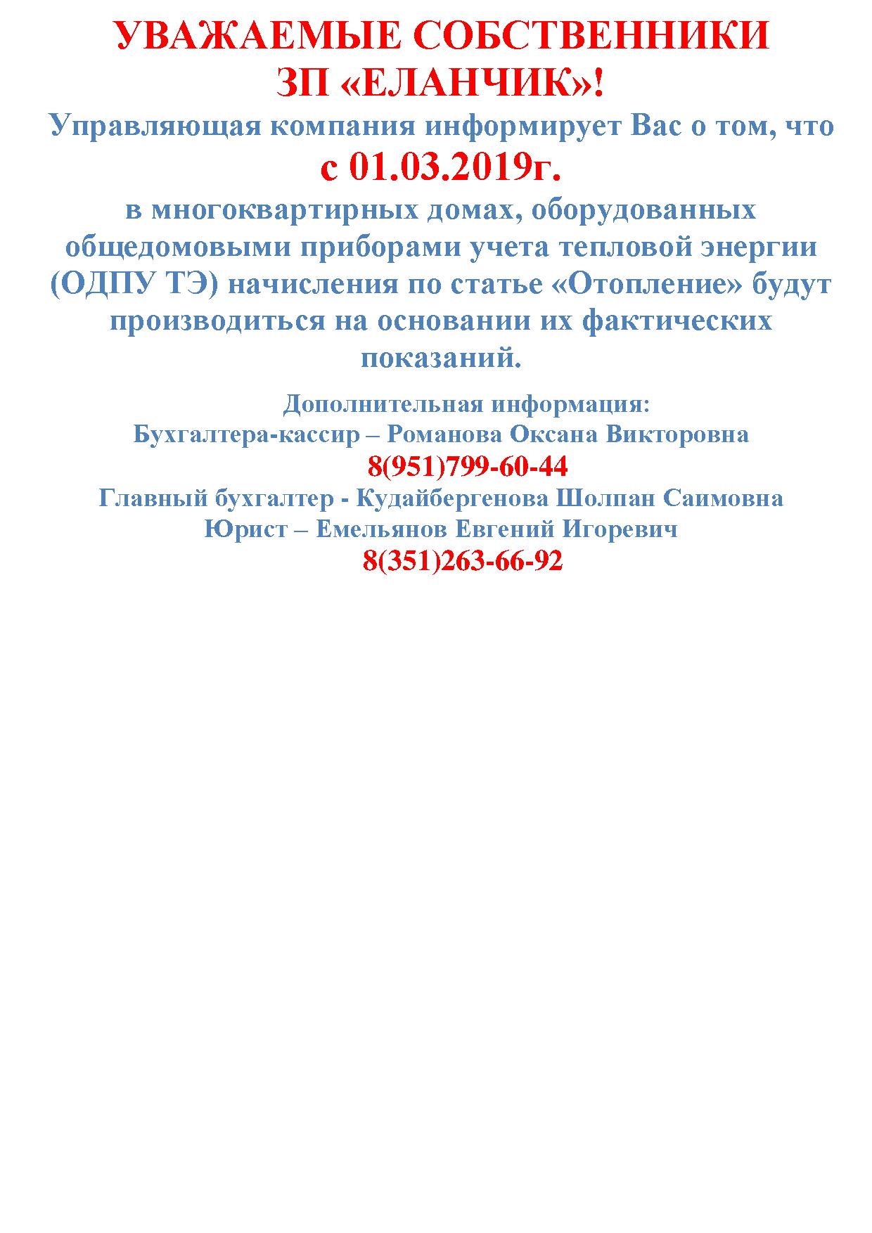 Сообщение о начале производства начислений по статье "Отопление" на основании показаний ОДПУ ТЭ