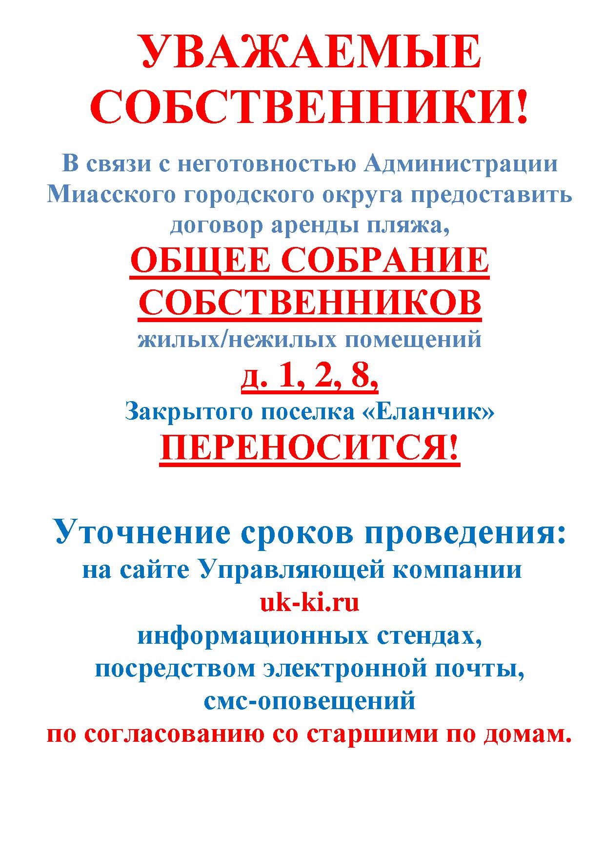 Объявление о переносе общего собрания собственников д. 1, 2, 8