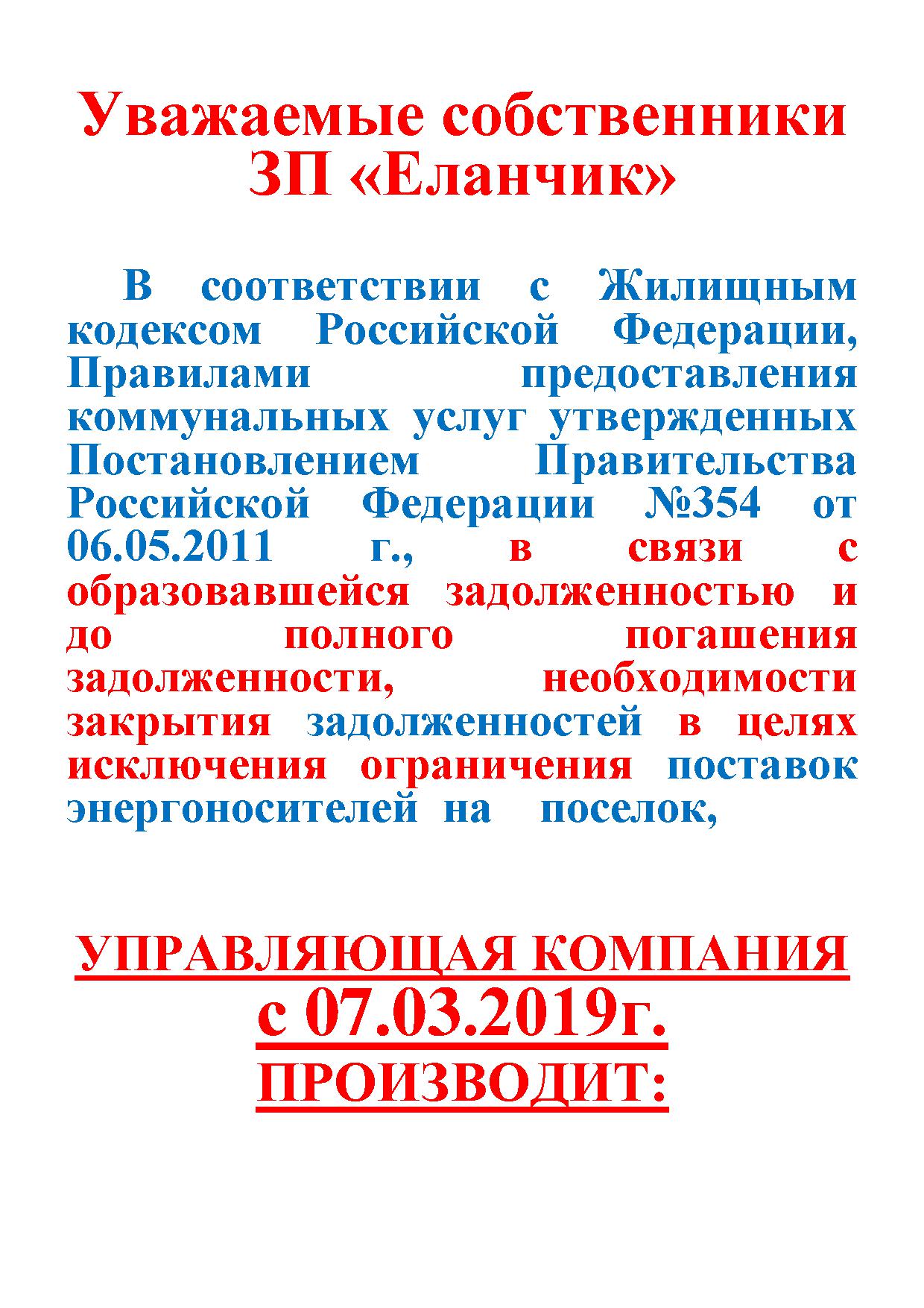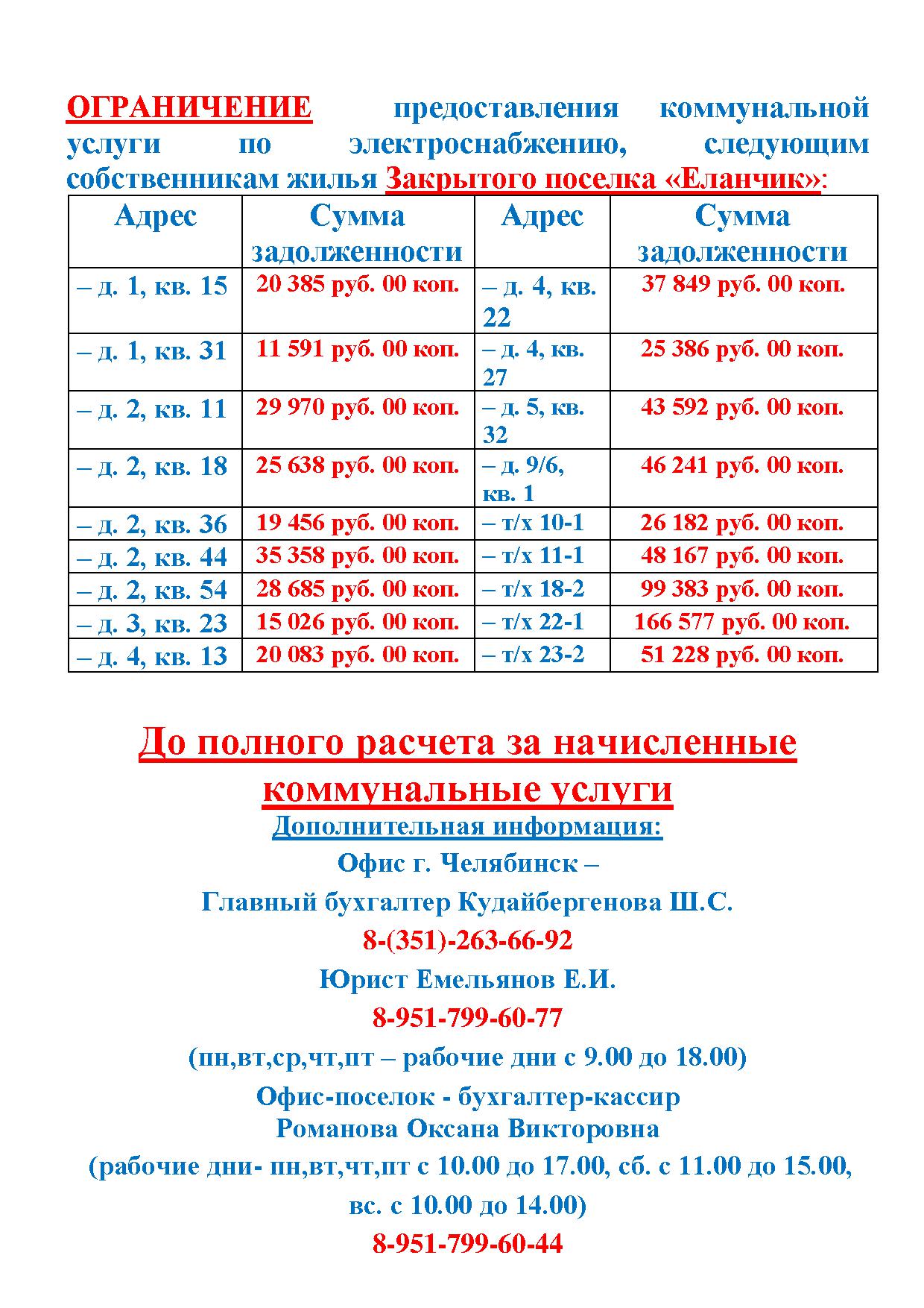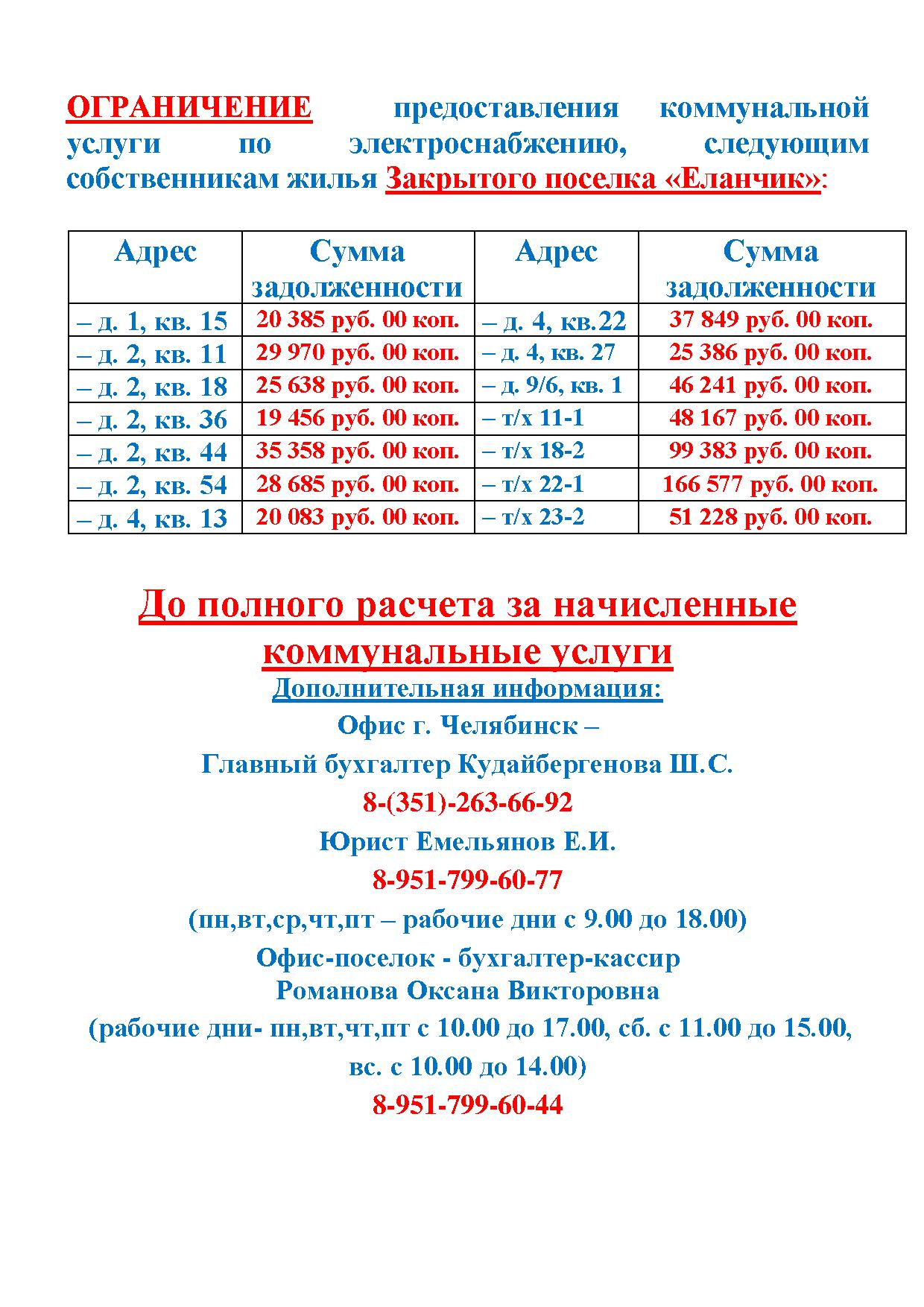 Уведомление собственникам недвижимости ЗП "Еланчик" о произведении ограничения предоставления услуги по электроснабжению собственникам, имующим задолженность по оплате жилищно-коммунальных услуг