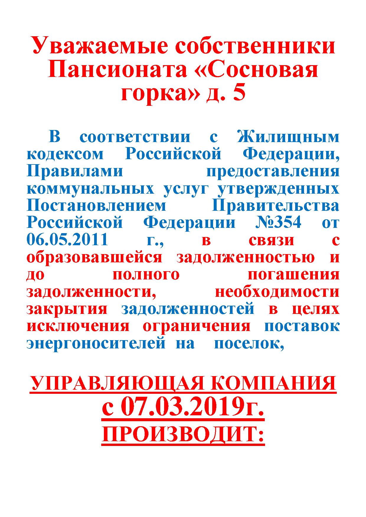 Уведомление собственникам недвижимости д. 5 Пансионата "Сосновая горка"о произведении приостановке предоставления услуги по электроснабжению собственникам, имующим задолженность по оплате жилищно-коммунальных услуг