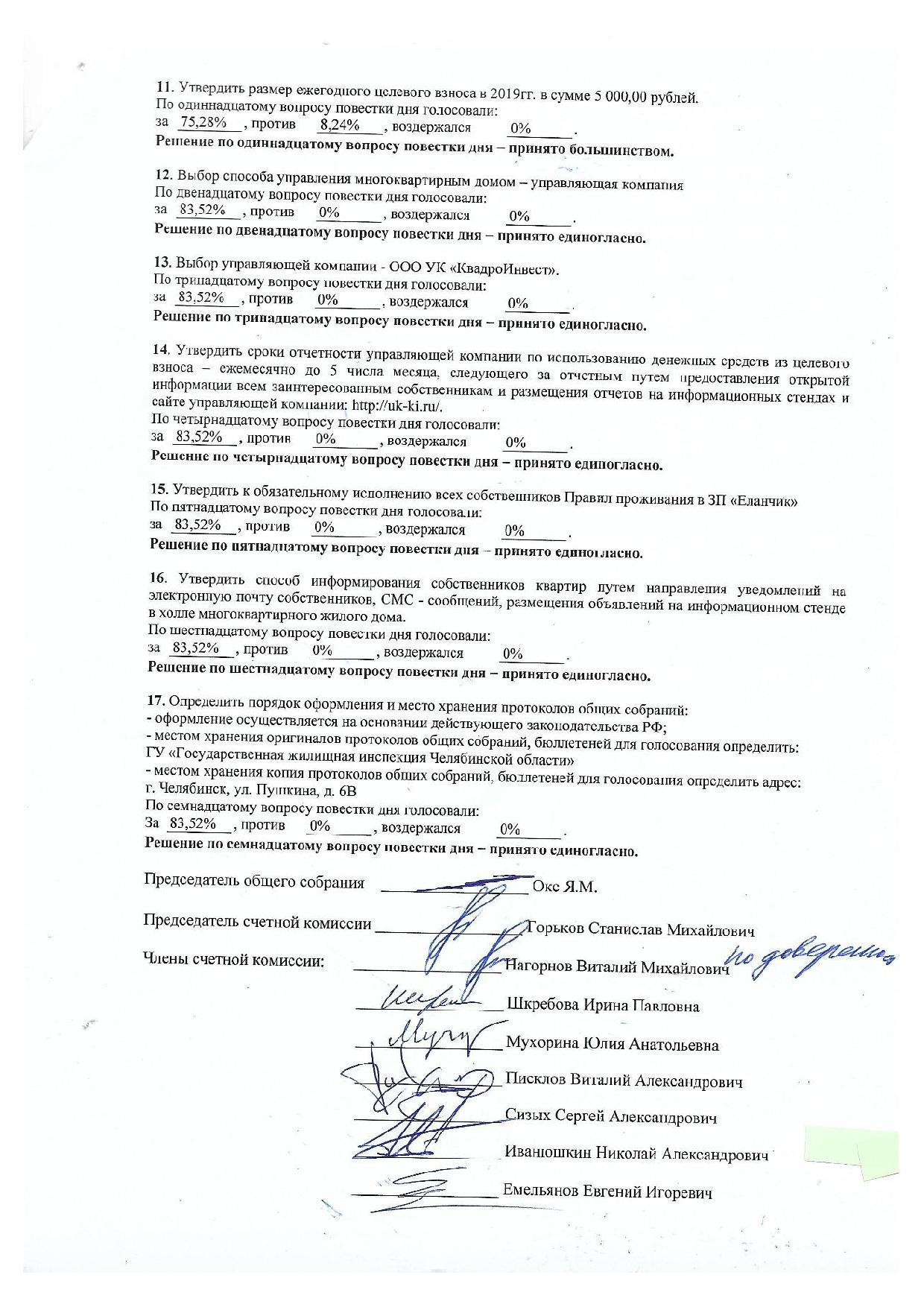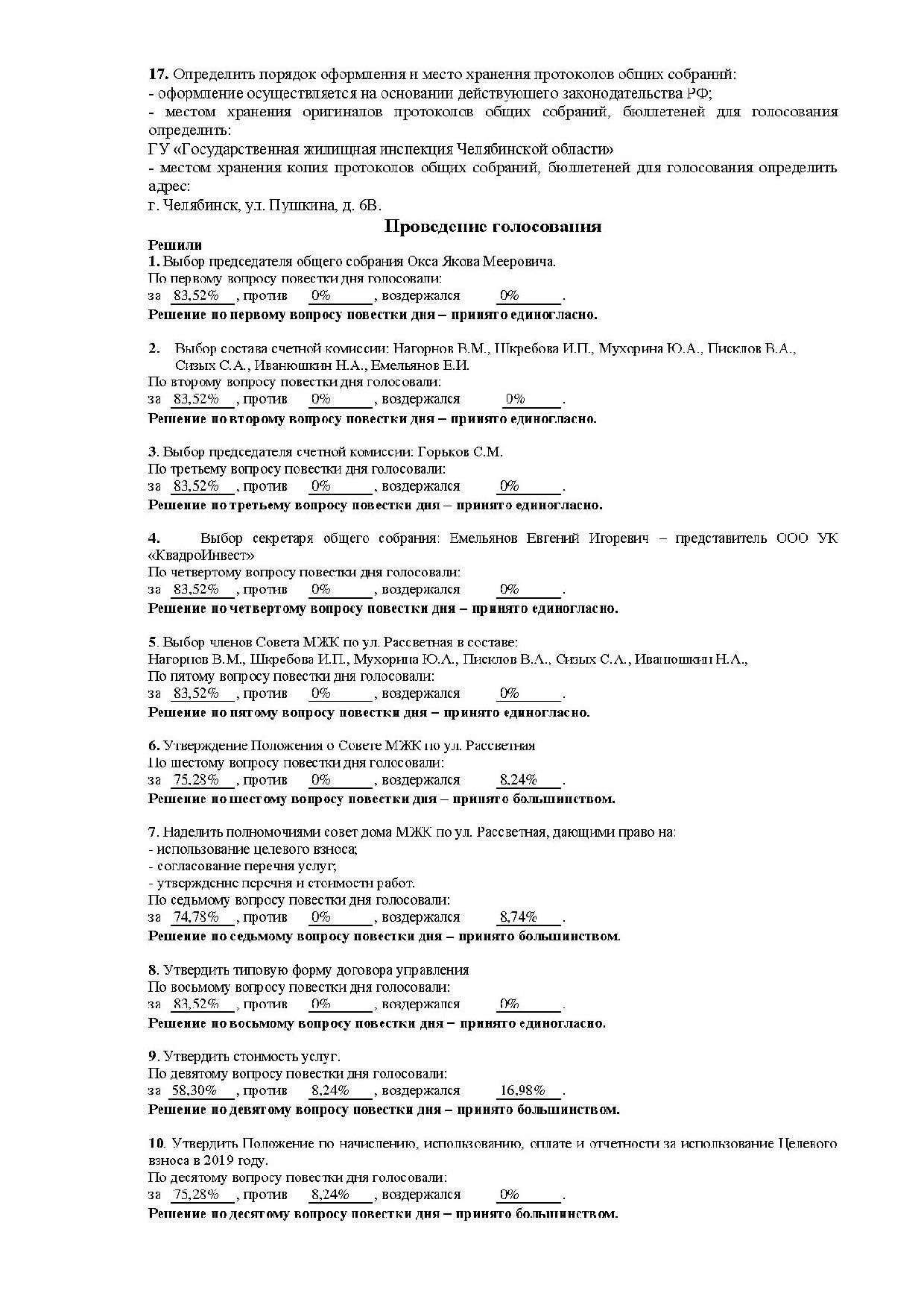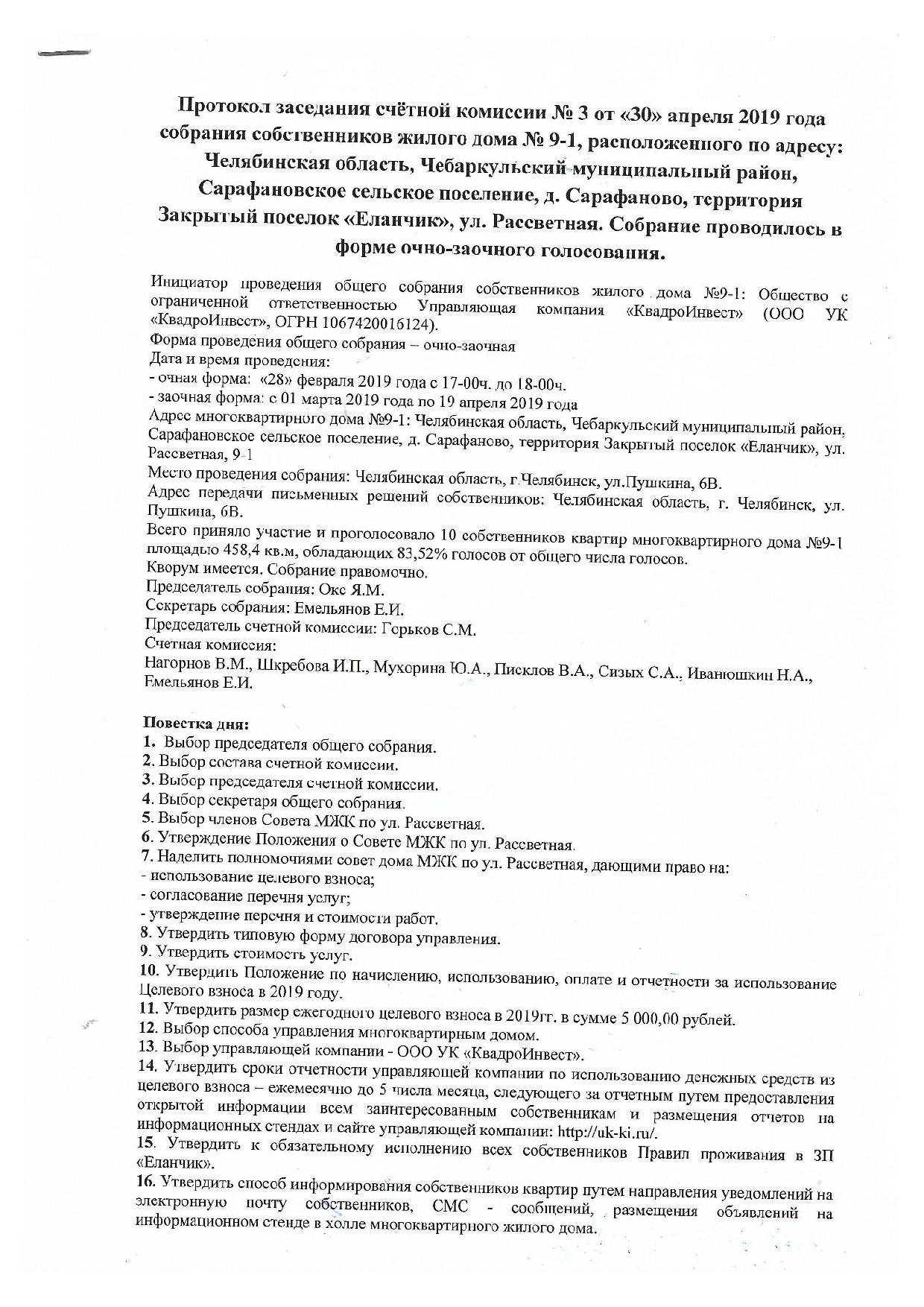 Результаты общего собрания собственников жилых/нежилых помещений многоквартирного дома 9-1, расположенного по адресу: Челябинская область, Чебаркульский муниципальный район, д. Сарафаново, тер. Закрытый поселок "Еланчик", ул. Рассветная