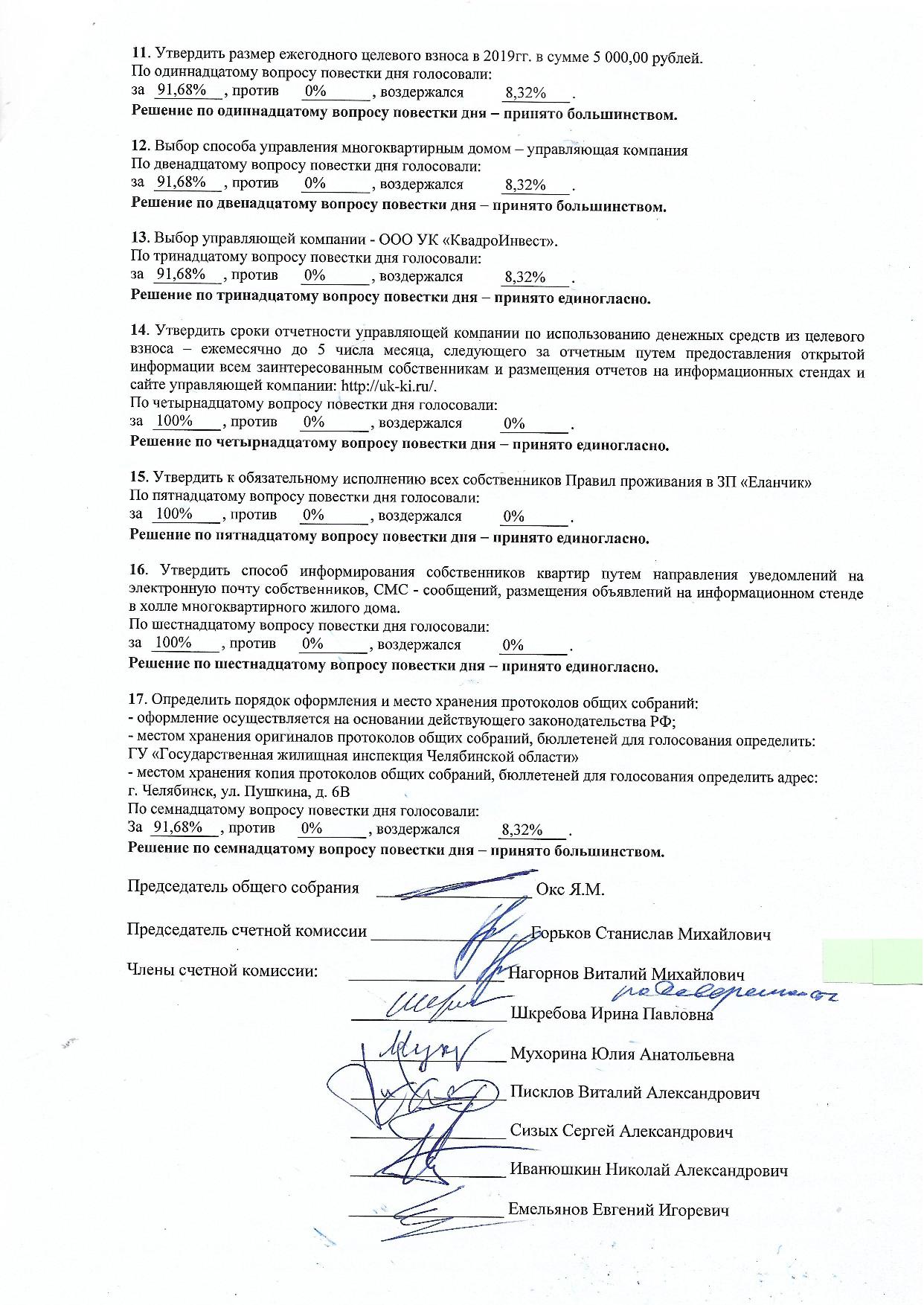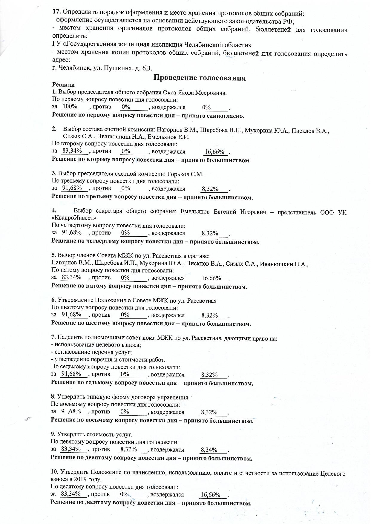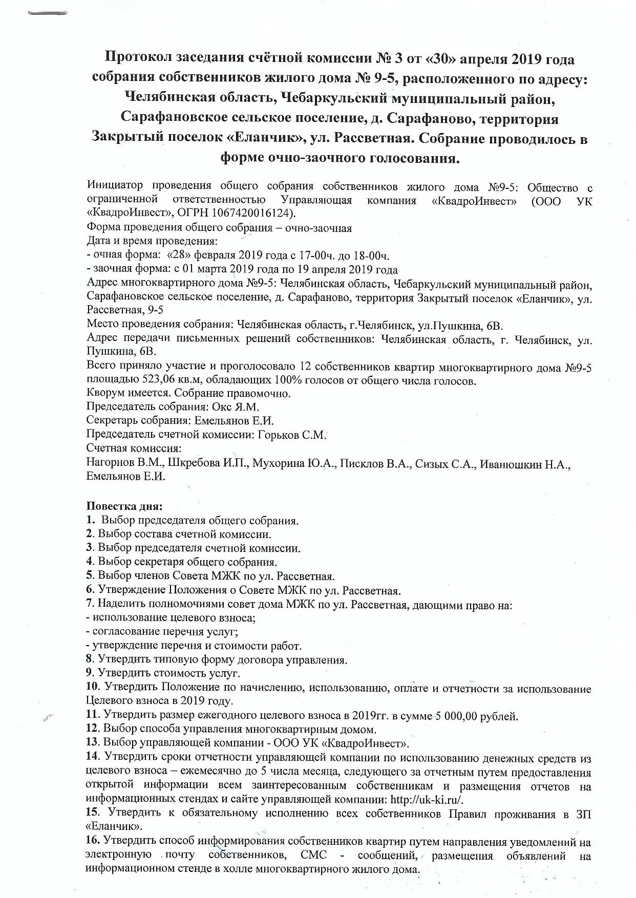 Результаты общего собрания собственников жилых/нежилых помещений многоквартирного дома 9-5, расположенного по адресу: Челябинская область, Чебаркульский муниципальный район, д. Сарафаново, тер. Закрытый поселок "Еланчик", ул. Рассветная