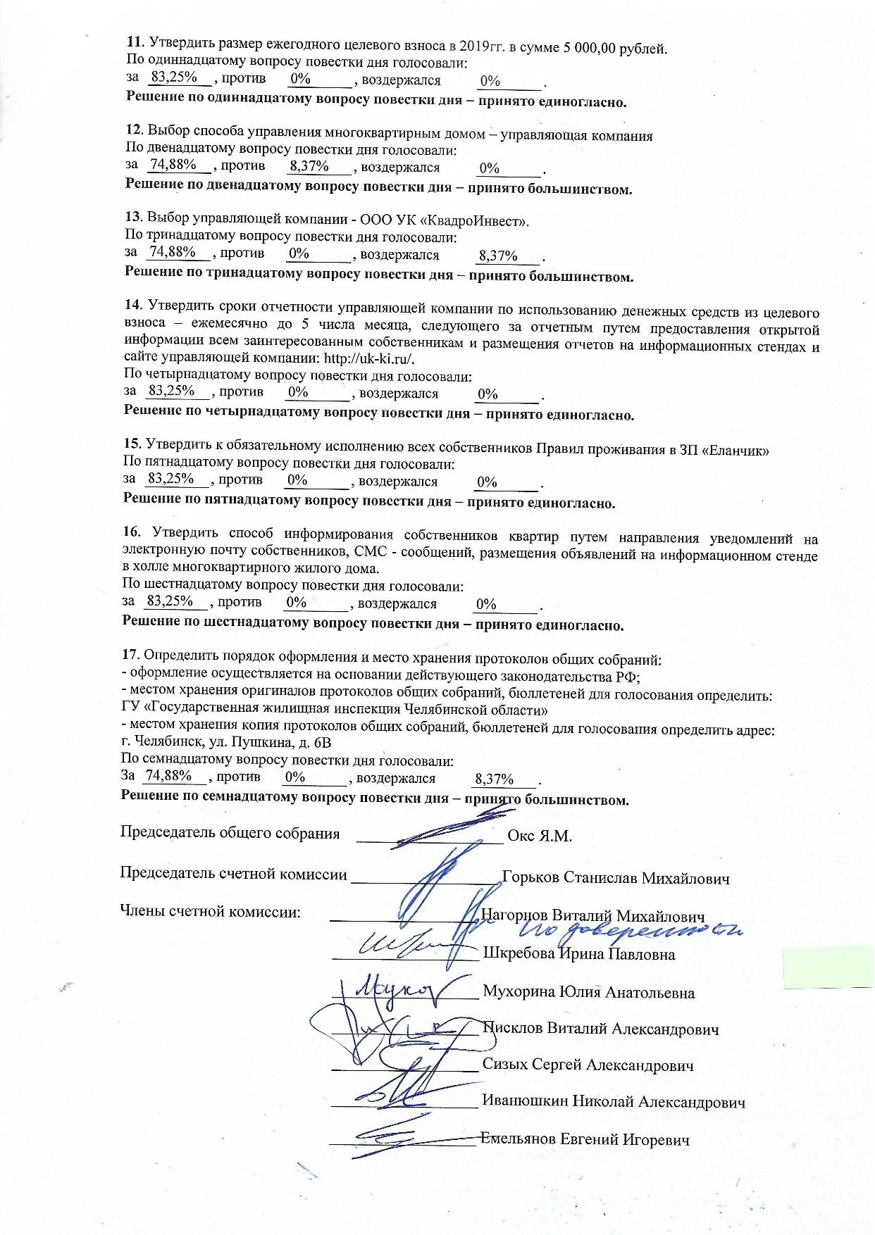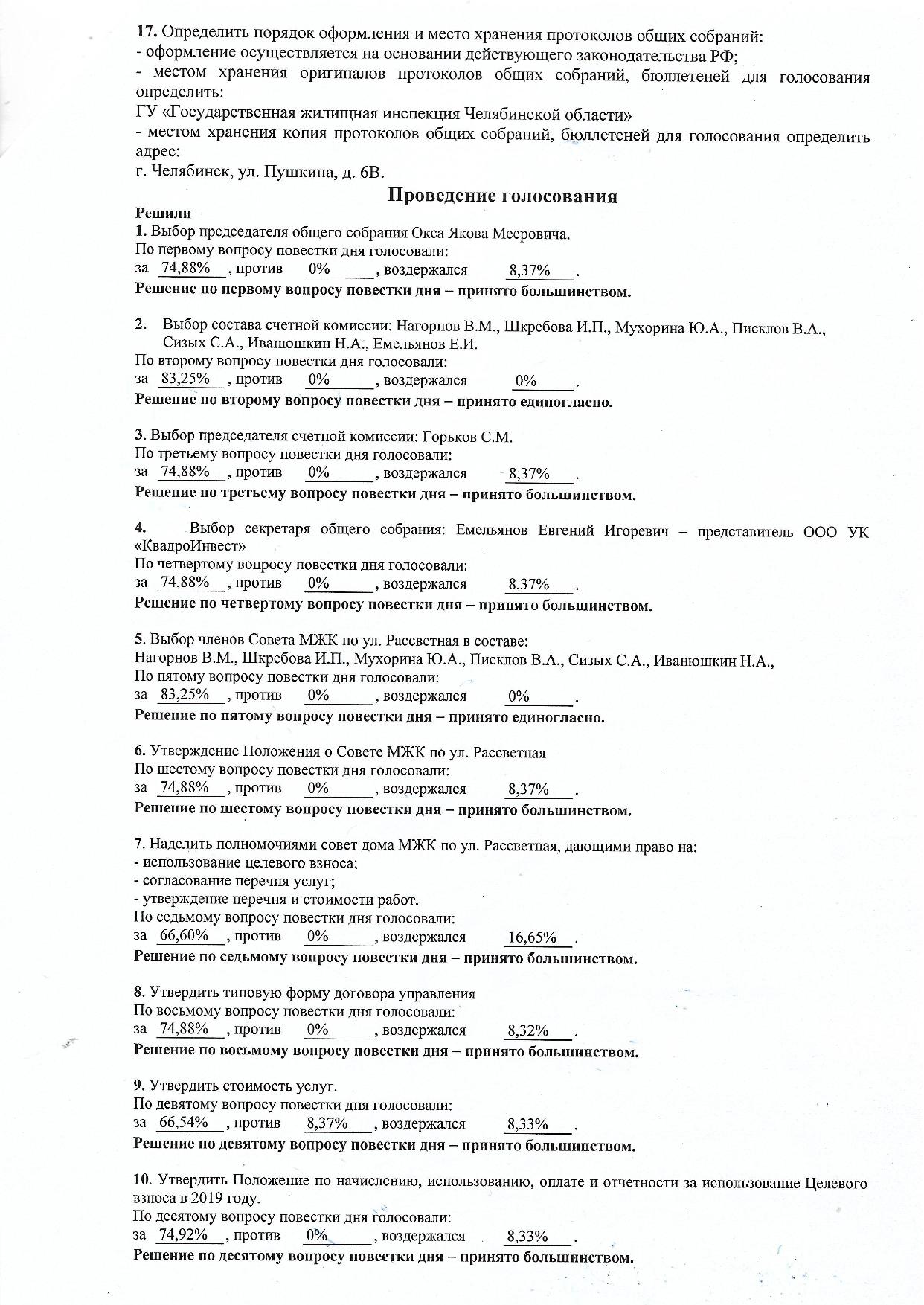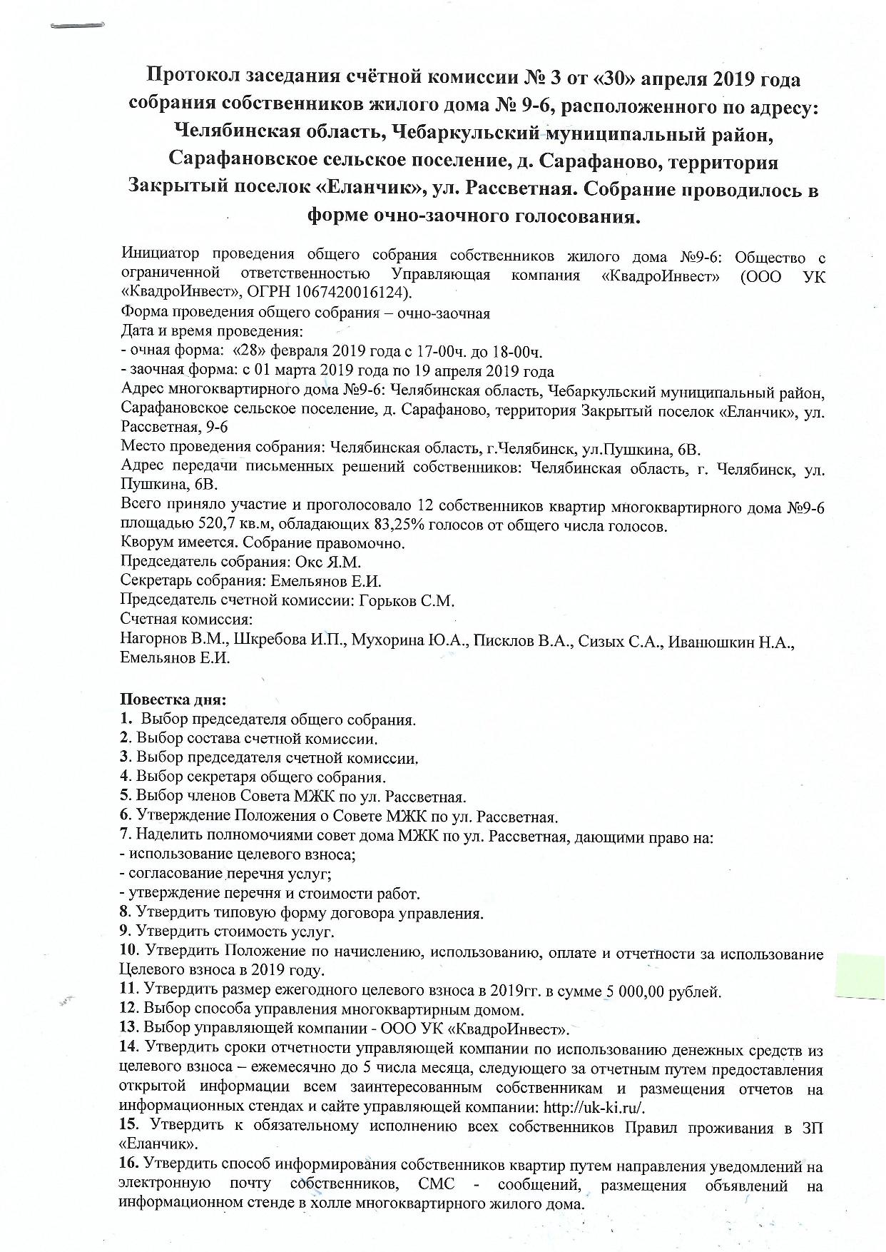 Результаты общего собрания собственников жилых/нежилых помещений многоквартирного дома 9-6, расположенного по адресу: Челябинская область, Чебаркульский муниципальный район, д. Сарафаново, тер. Закрытый поселок "Еланчик", ул. Рассветная