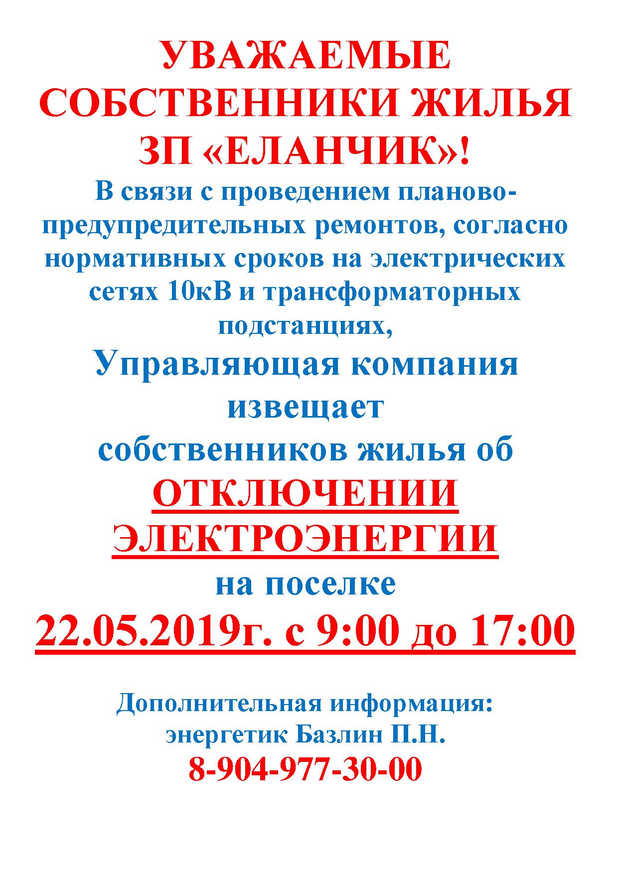 Уведомление собственникам жилых/нежилых помещений Закрытого поселка "Еланчик" об отключении электроэнергии в связи с планово-предупредительными работами