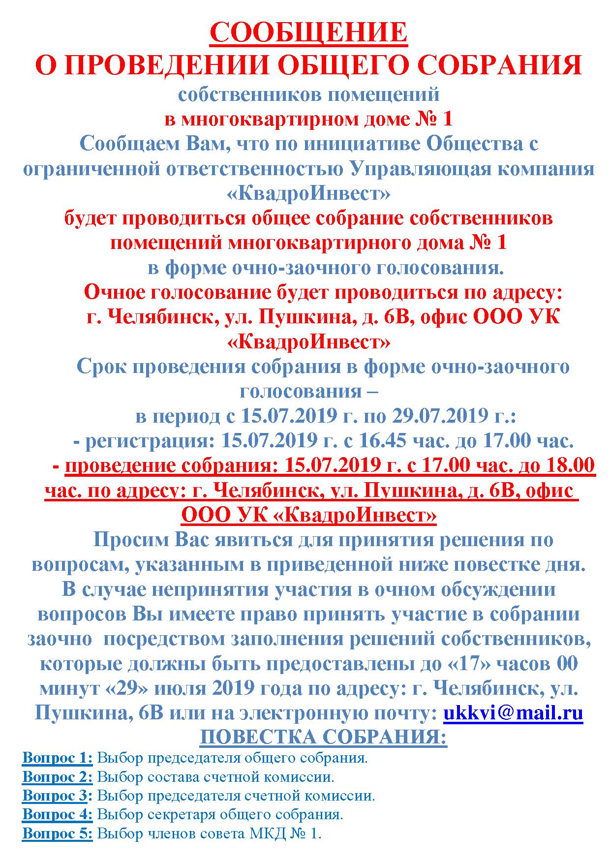 Сообщение о проведении общего собрания собственников д. 1 Закрытого поселка "Еланчик"