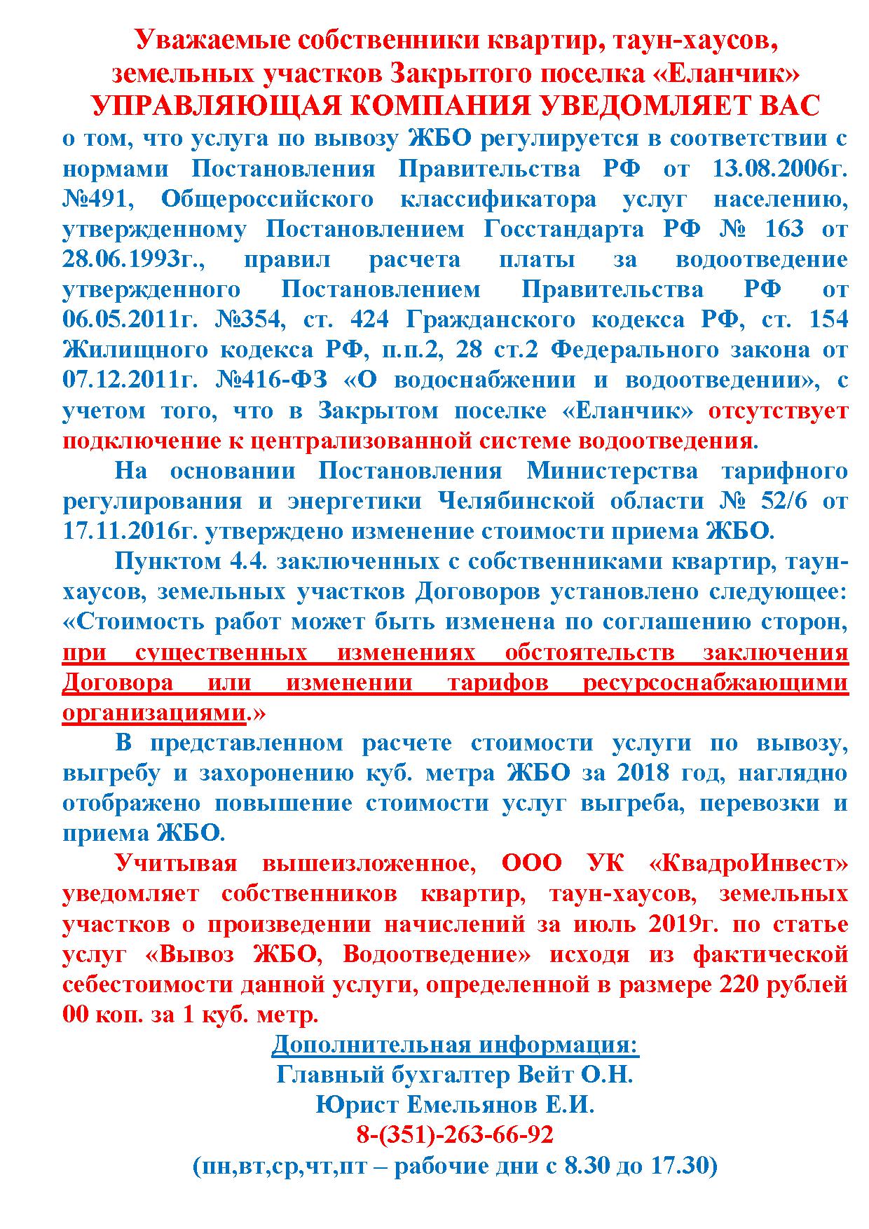 Уведомление собственникам квартир, таун-хаусов, земельных участков об изменении стоимости услуги "Вывоз ЖБО, водоотведение"