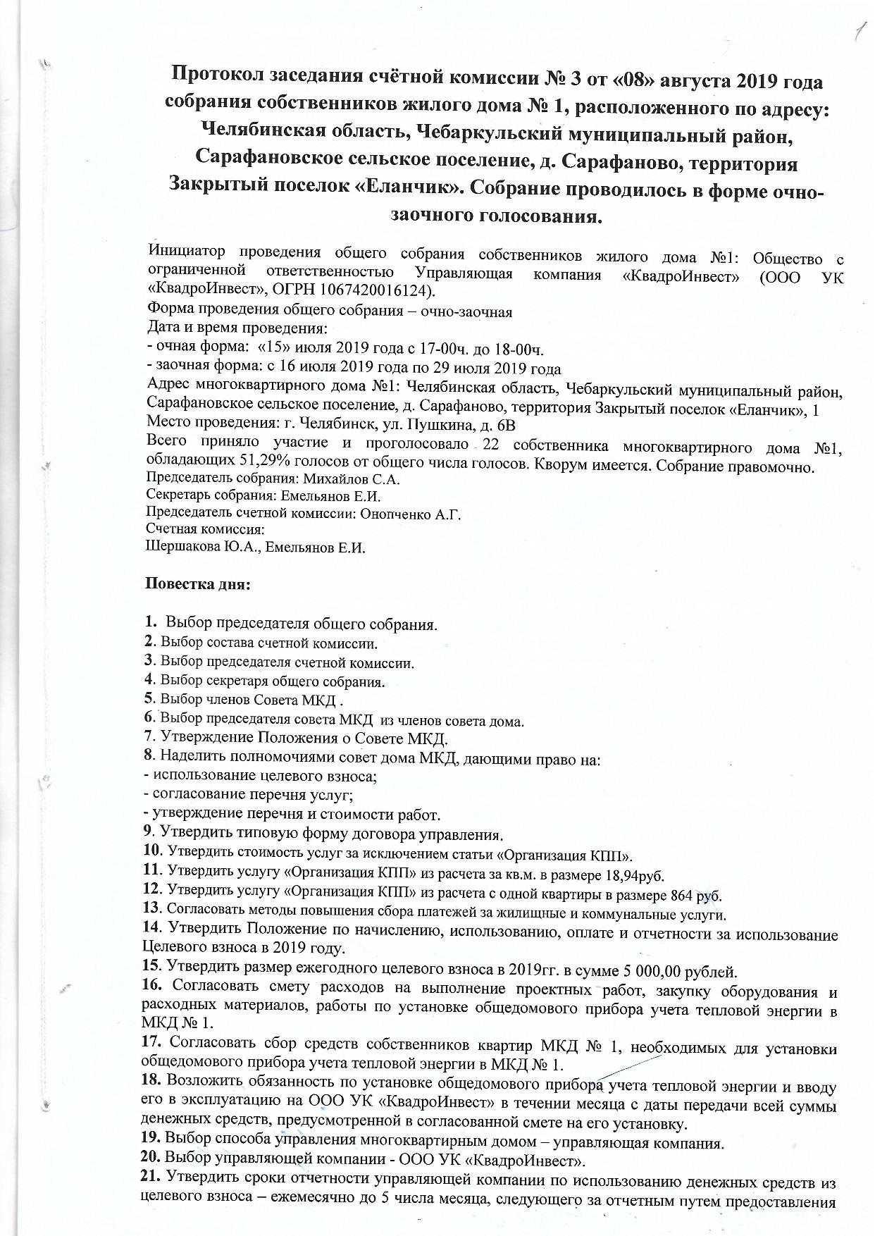 Итоги общего собрания собственников многоквартирного дома № 1 Закрытого поселка "Еланчик"