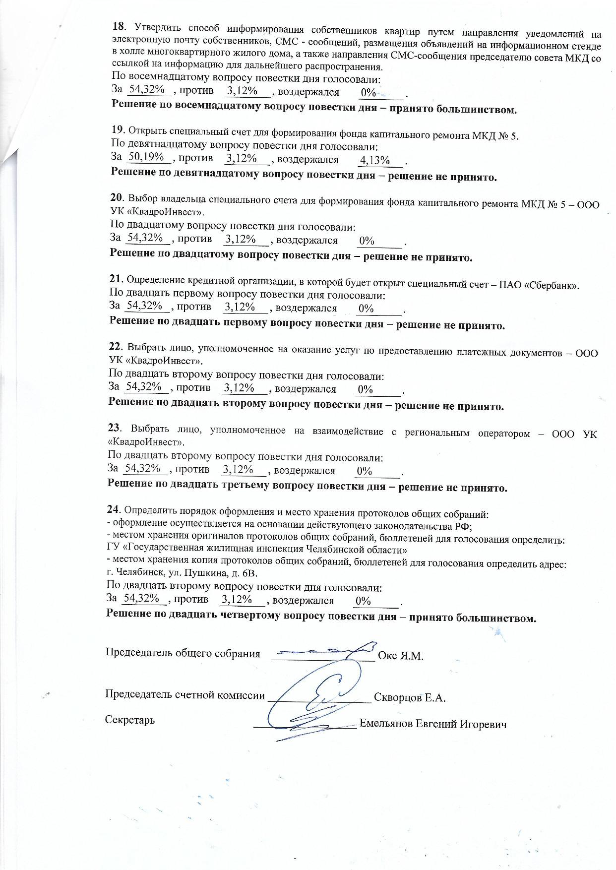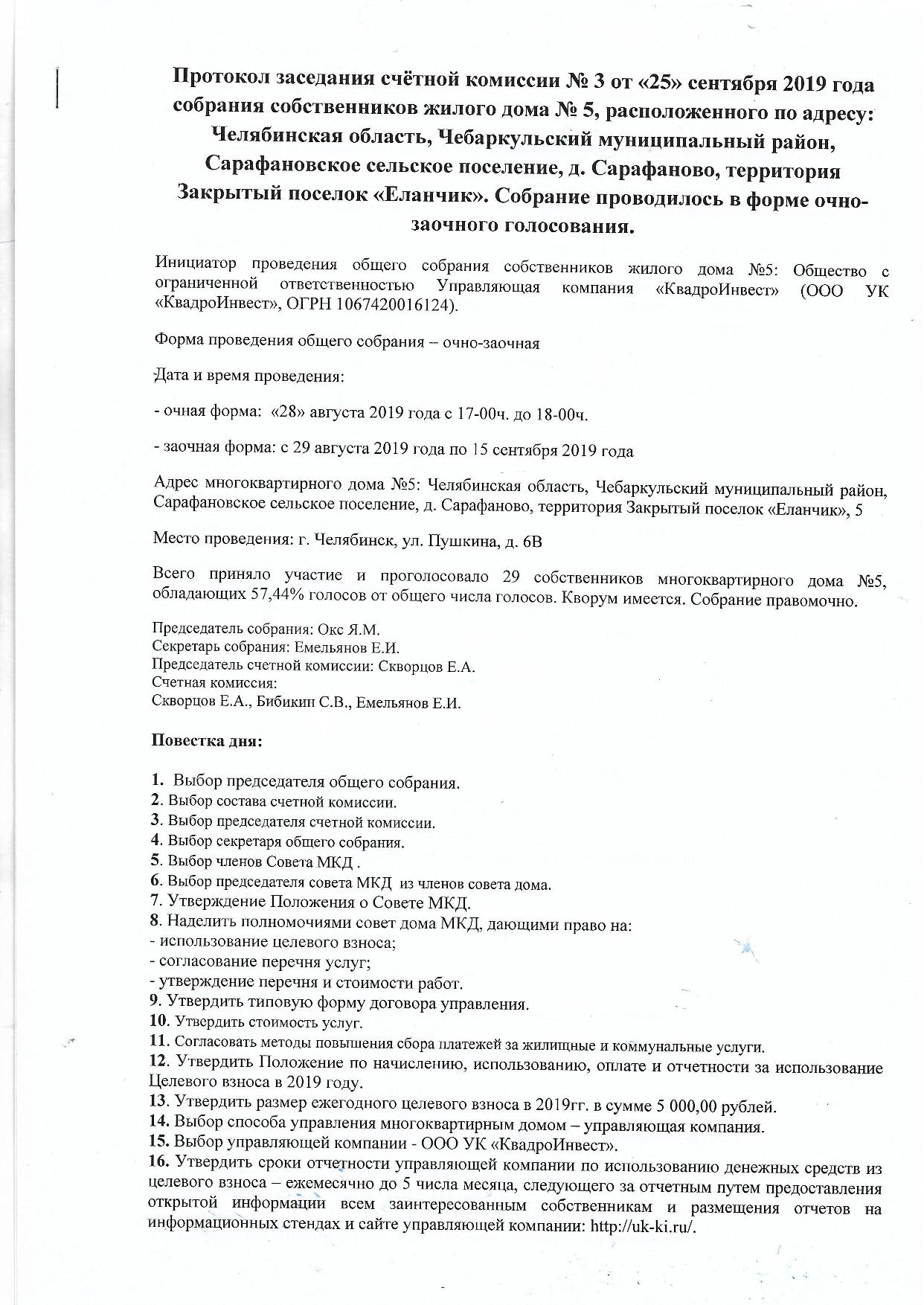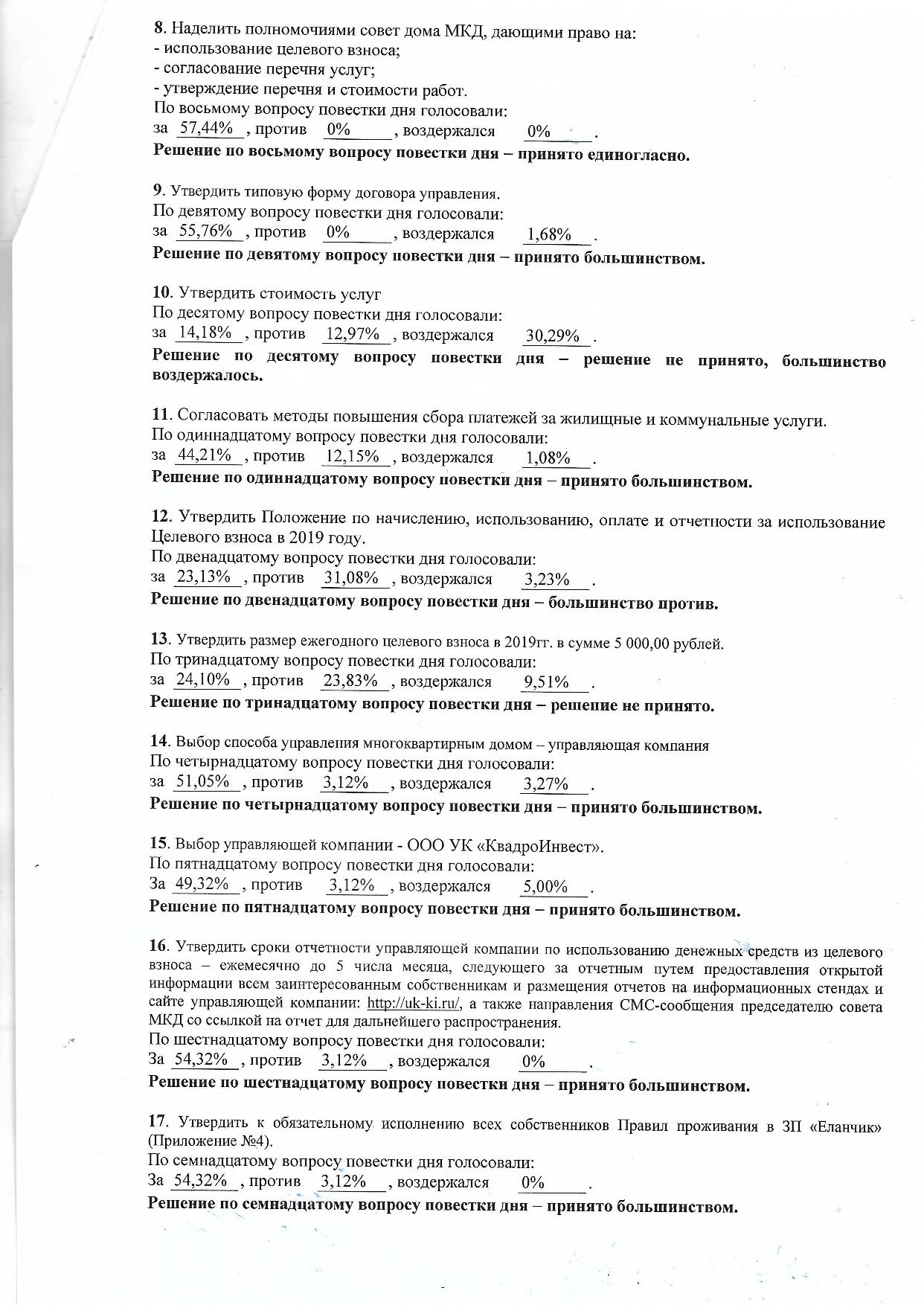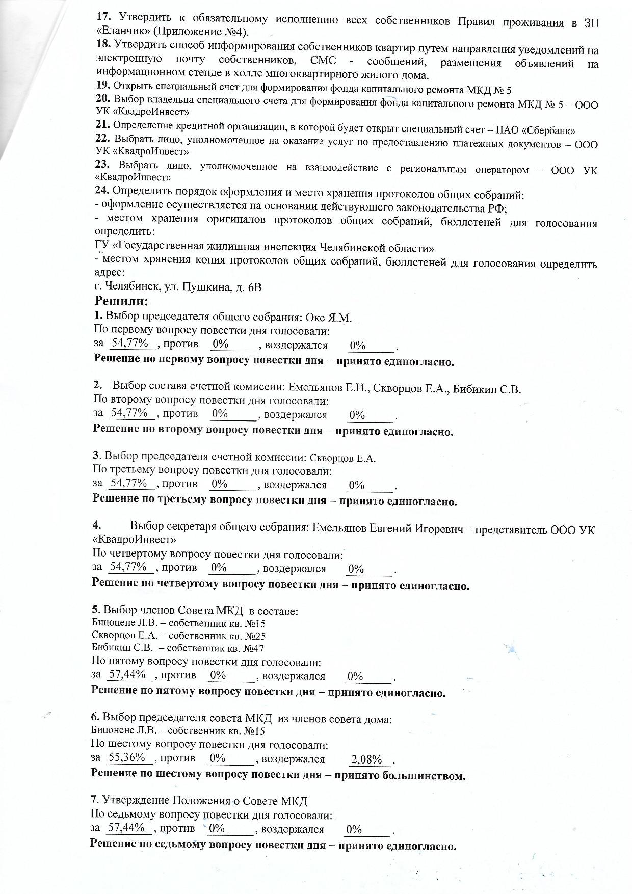 Результаты общего собрания д. 5 Закрытого поселка "Еланчик"