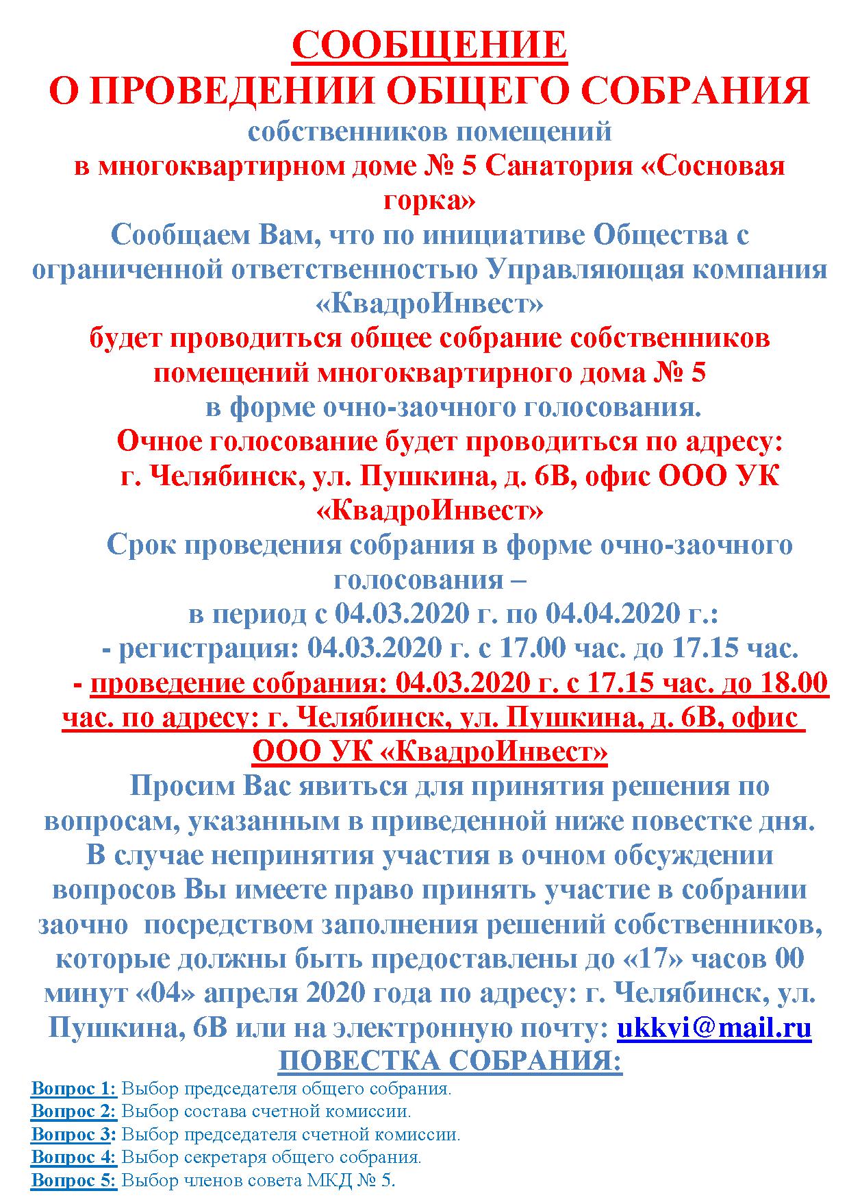Сообщение о проведении общего собрания собственников жилых/нежилых помещений многоквартирного дома № 5 "Санатория "Сосновая горка" 04.03.2020г.