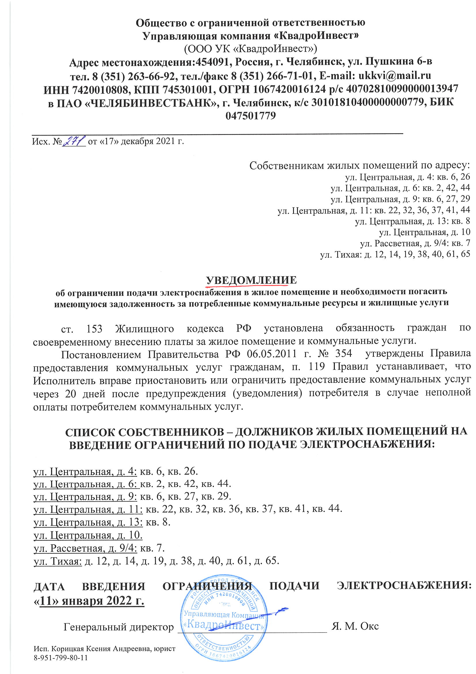 УВЕДОМЛЕНИЕ об ограничении подачи электроснабжения в жилое помещение от 17.12.2021