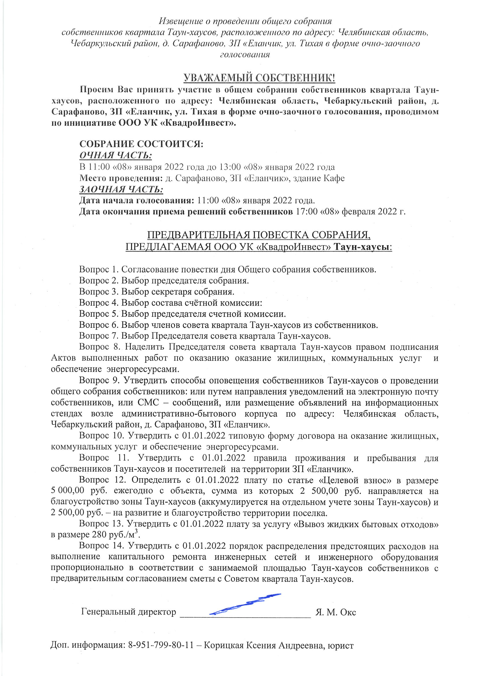 Сообщение о проведении собрания собственников Таун-хаусов