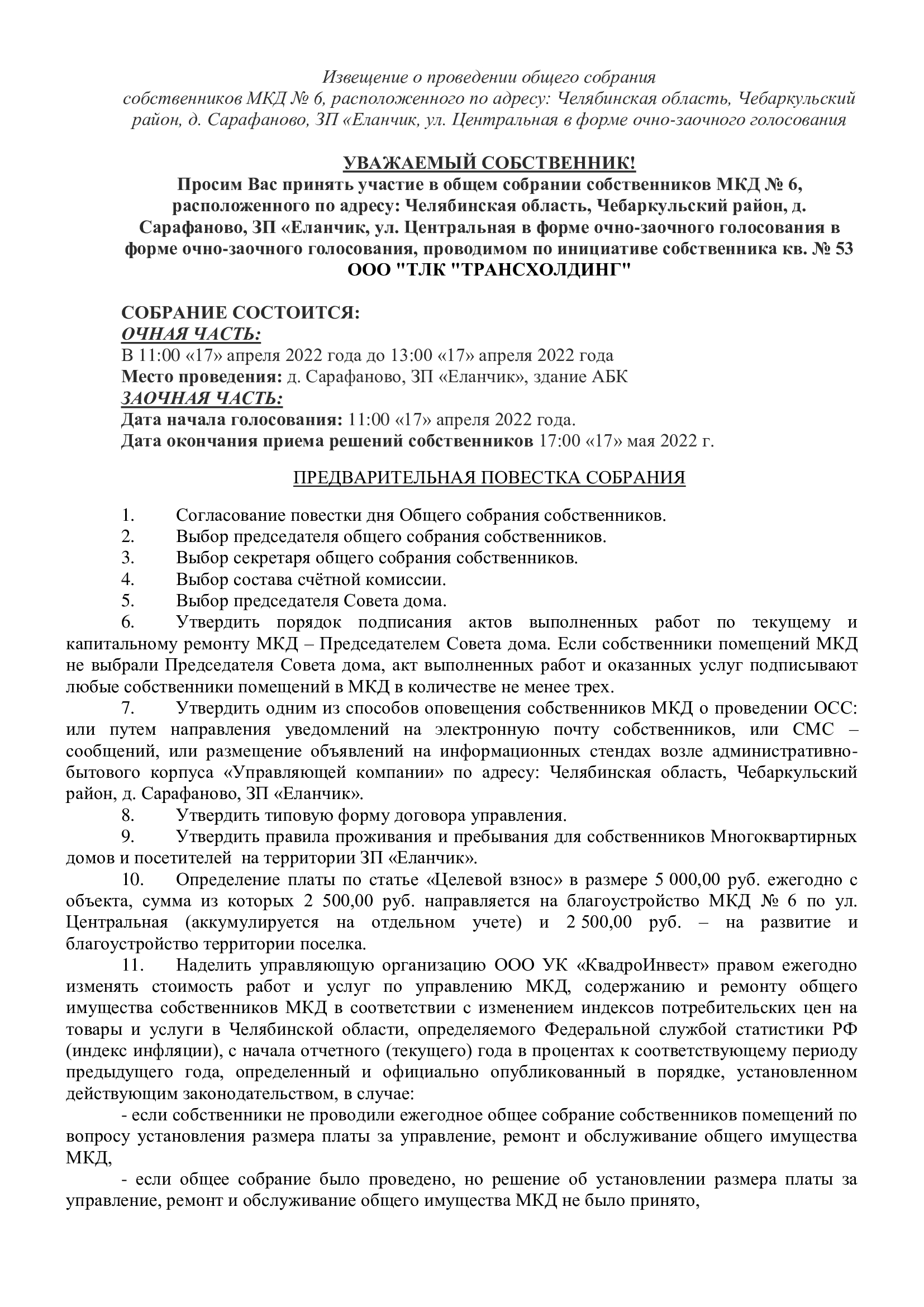 Сообщение о проведении общего собрания собственников помещений многоквартирного дома № 6 по ул. Центральная Закрытого поселка "Еланчик" в форме очно-заочного голосования в период с 17.04.2022г. по 17.05.2022 г.