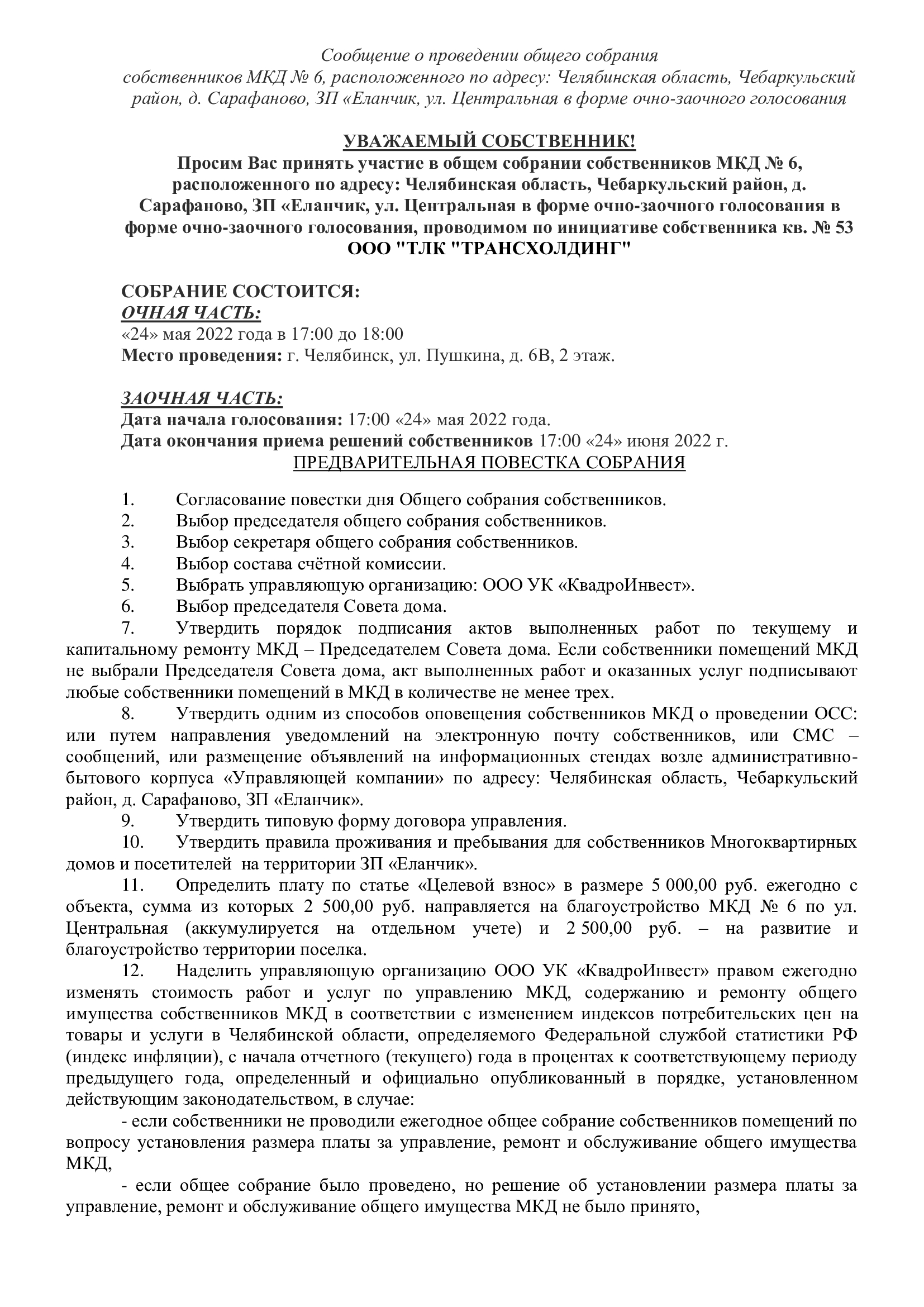 Сообщение о проведении общего собрания собственников помещений многоквартирного дома № 6 по ул. Центральная Закрытого поселка "Еланчик" в форме очно-заочного голосования в период с 24.05.2022г. по 24.06.2022 г.
