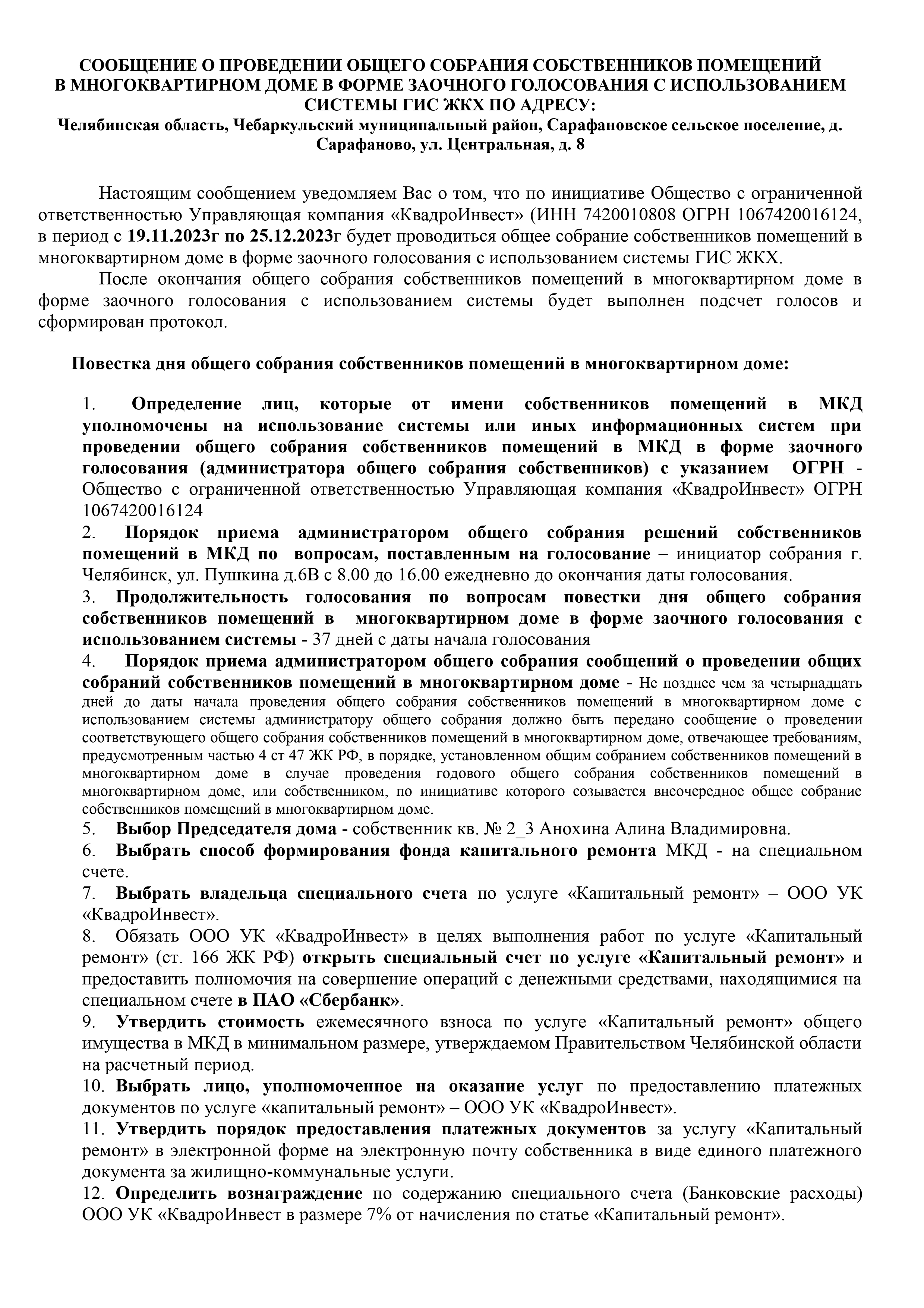 Сообщение о проведении собрания ул. Центральная, д. 8