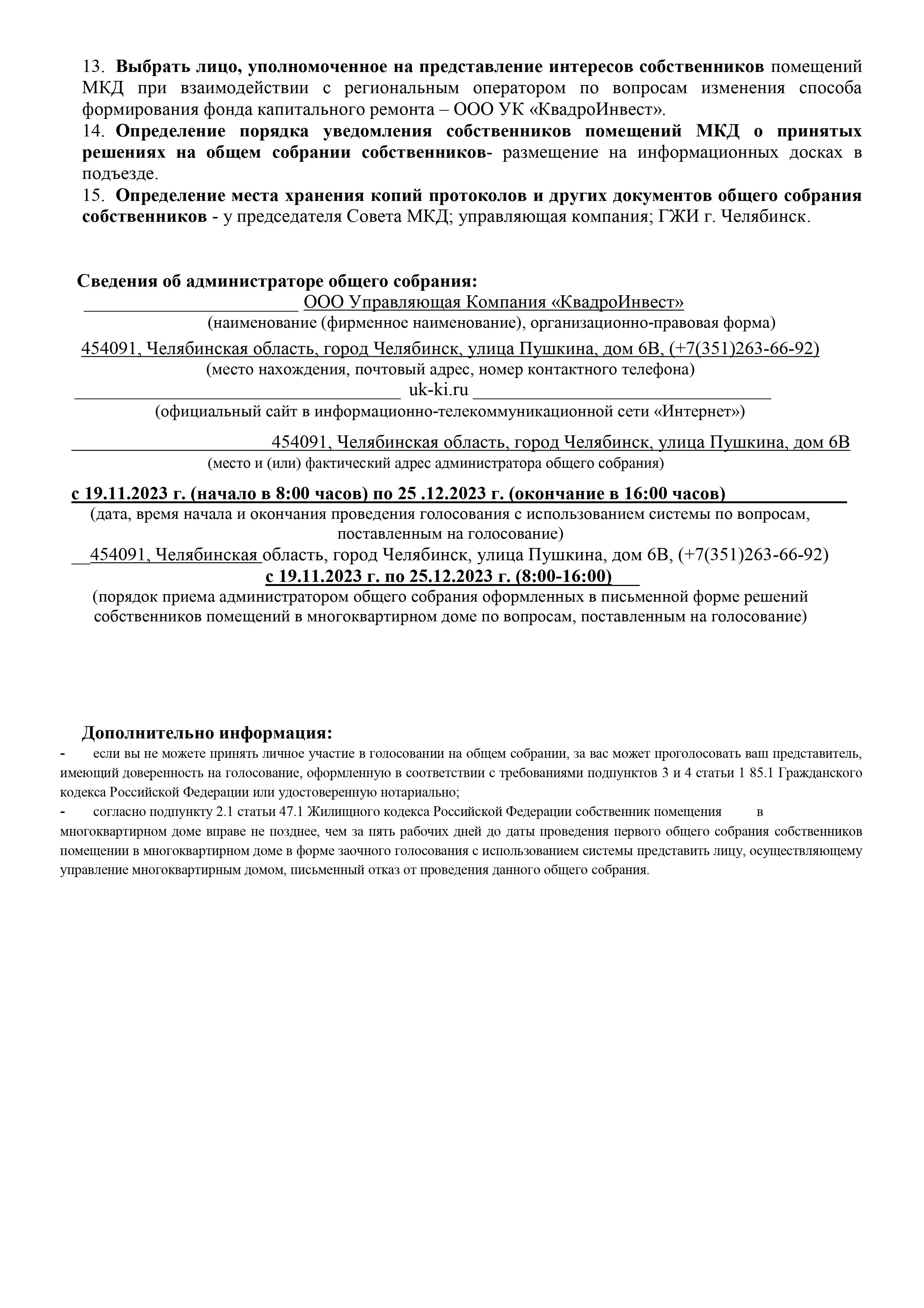 Принять участие в собрании Вы сможете с 19.11.2023 (бюллетени будут направлены на электронные почты в день начала голосования, а также будут находиться в здании АБК в ЗП "Еланчик" и по адресу ул. Пушкина, д. 6В). Помимо прочего Вы можете проголосовать электронно с использованием системы ГИС ЖКХ, итоги собрания будут объявлены после 25.12.2023 путем подсчета бюллетеней, переданных в УК лично и данных, обработанных в системе ГИС ЖКХ.
