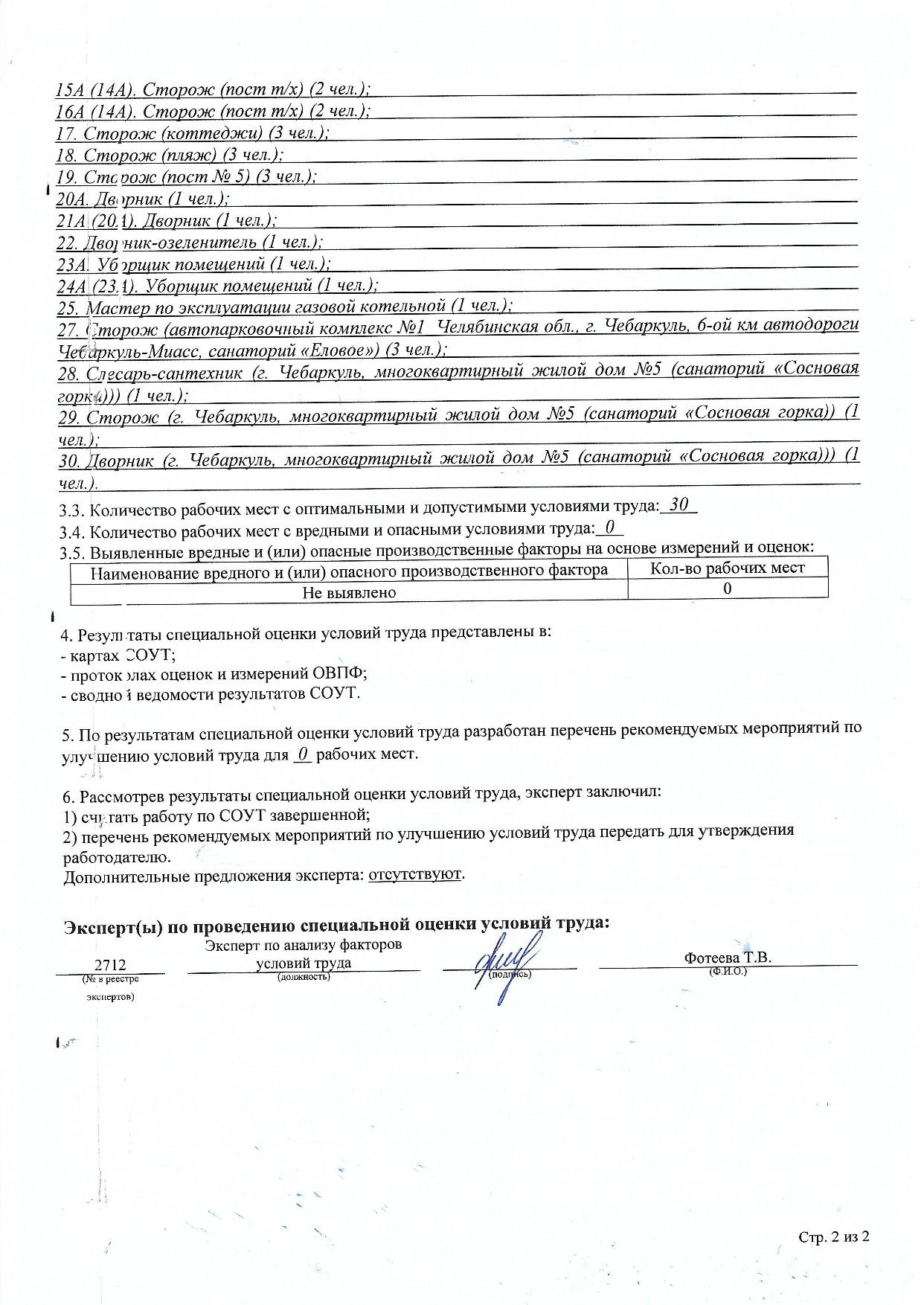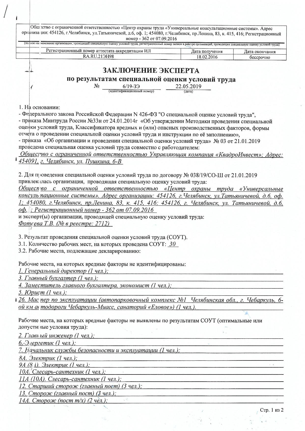 Заключение эксперта по результатам специальной оценки условий труда в ООО УК "КвадроИнвест"
