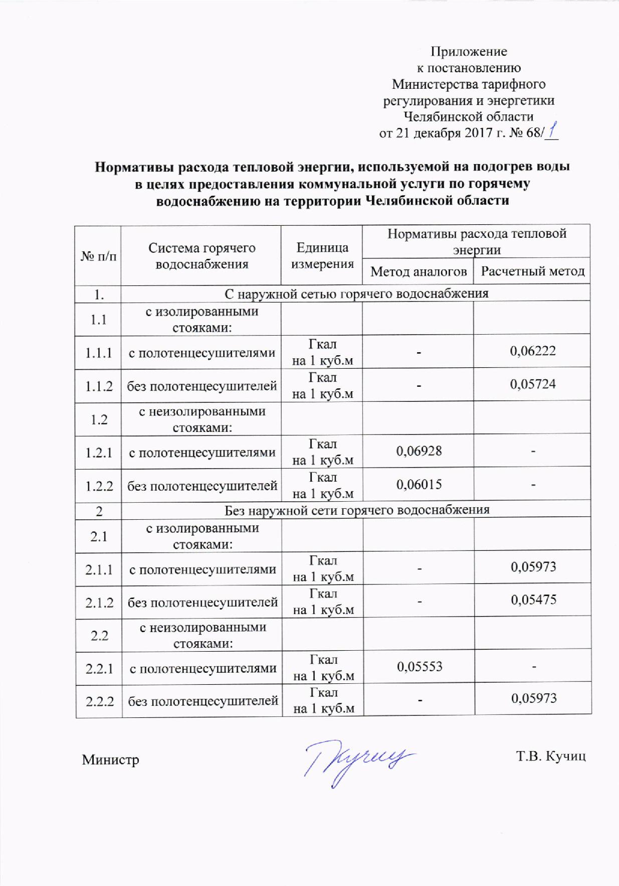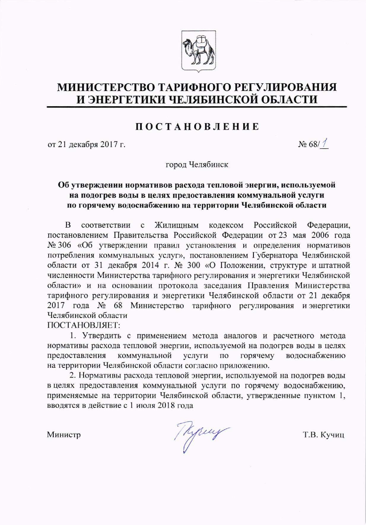 Постановление Министерства тарифного регулирования и энергетики Челябинской области № 68/1 от 21.12.2017г.
