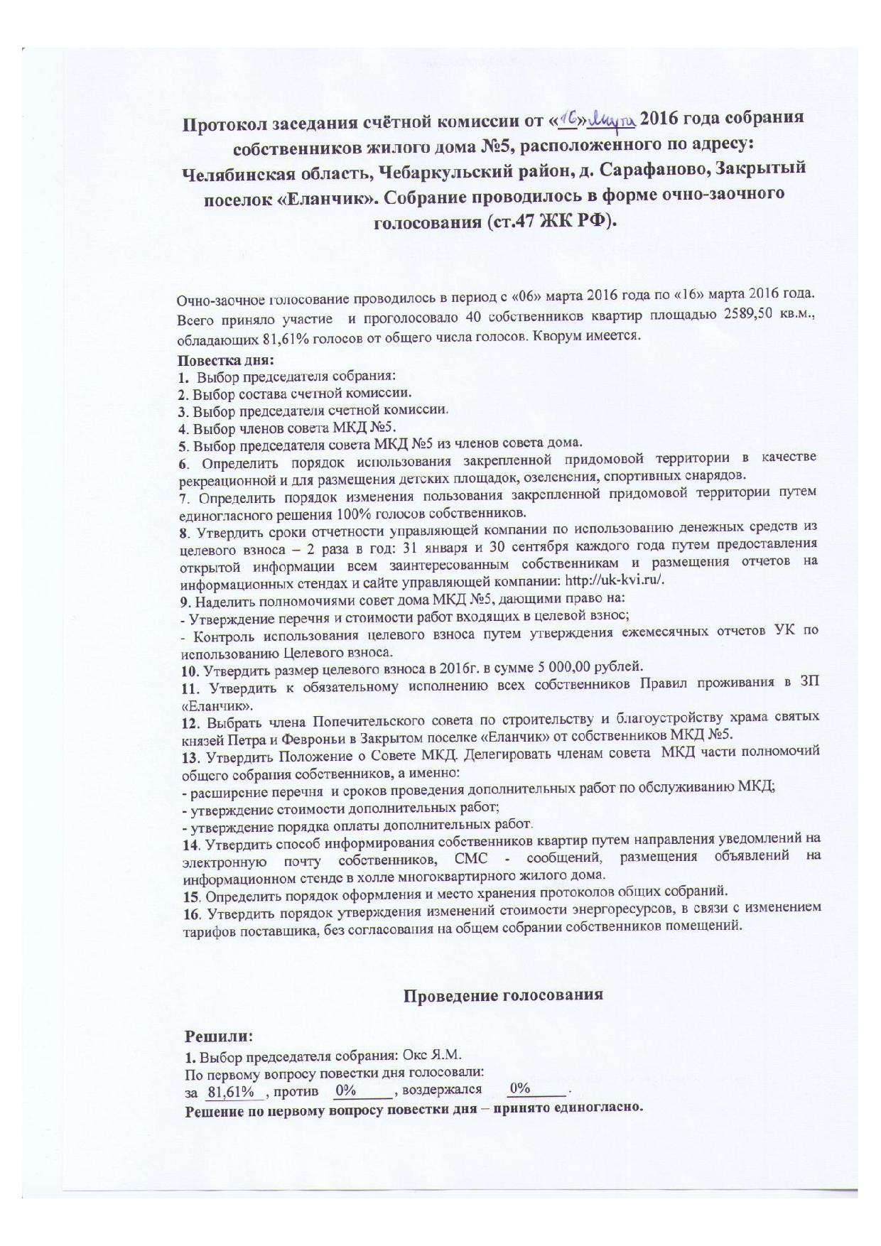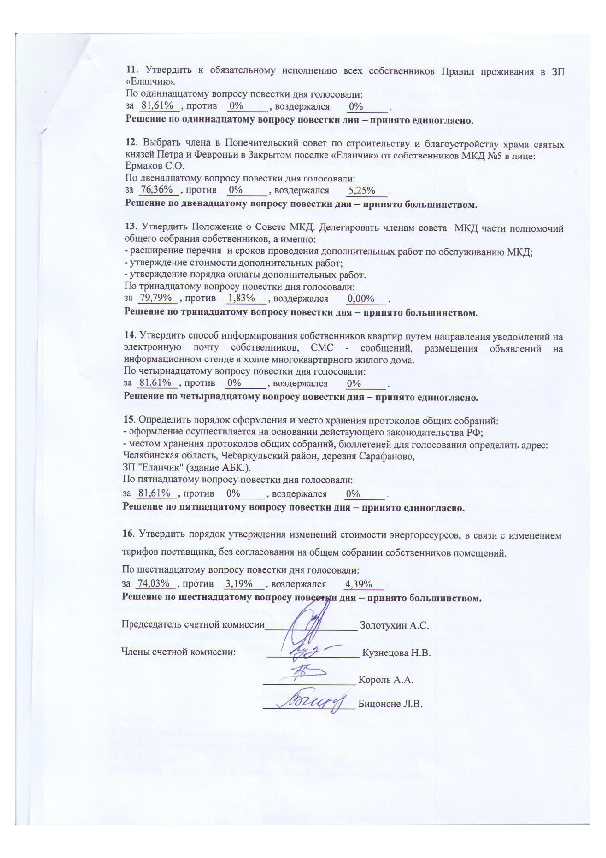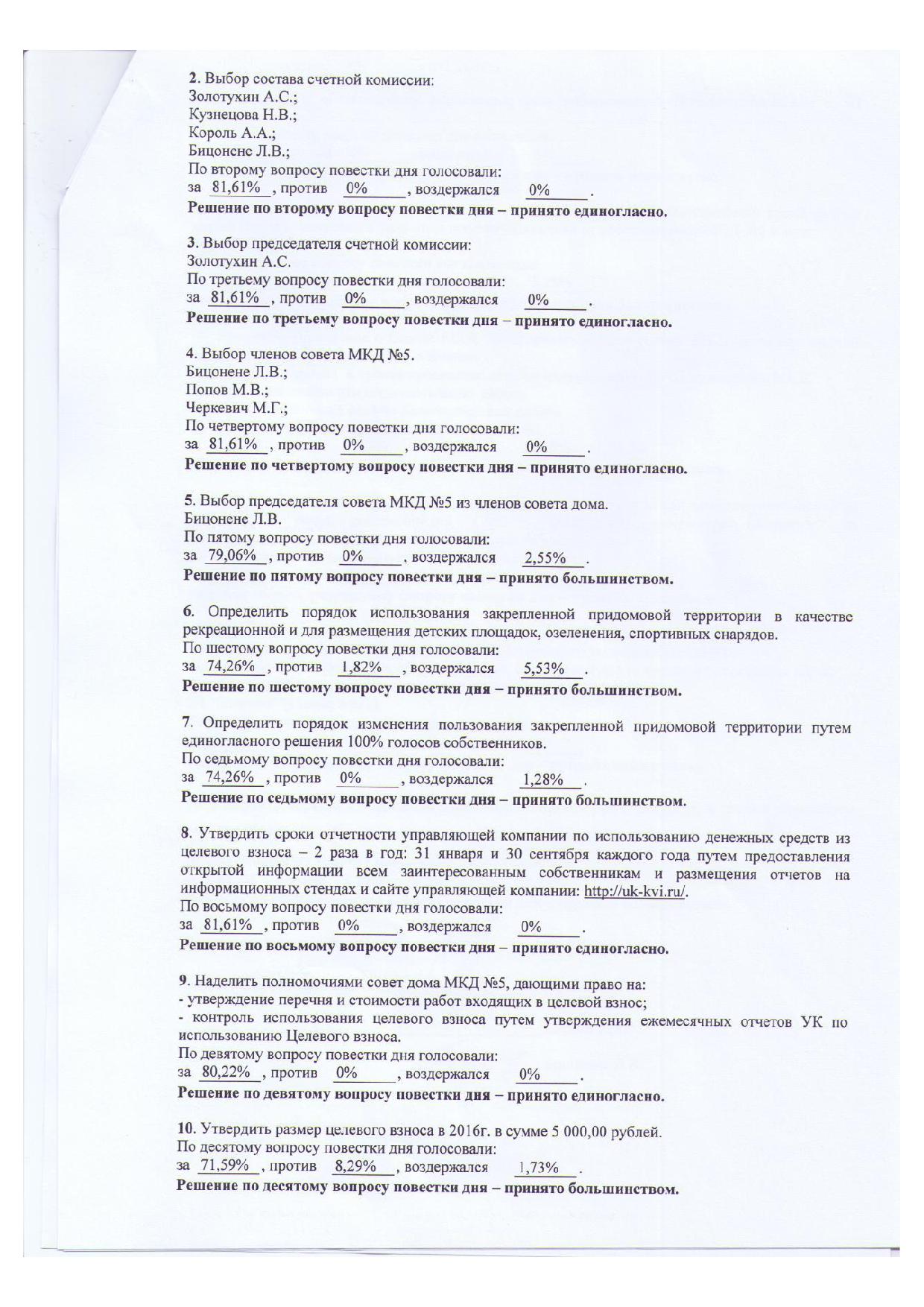 Результаты общих собраний д. 5 Закрытого поселка "Еланчик"